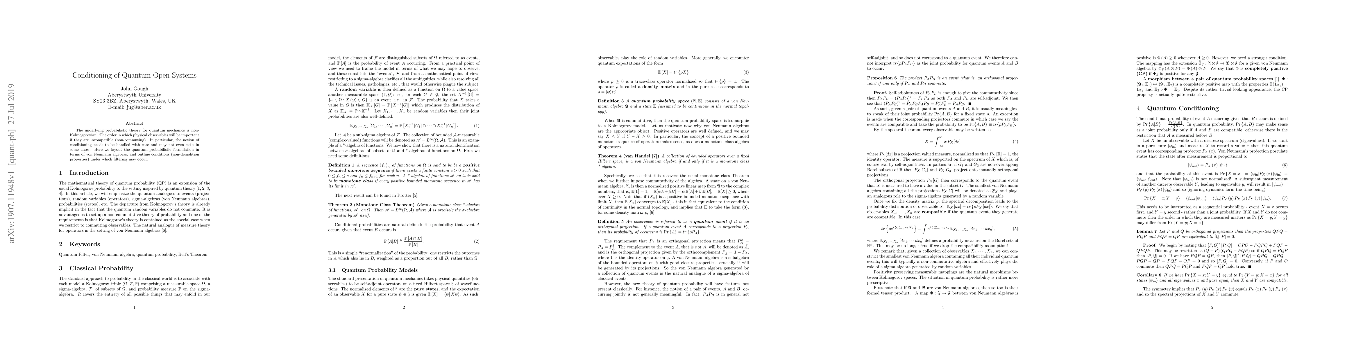 This paper explores quantum probabilistic theory beyond Kolmogorovian frameworks, focusing on the non-commuting nature of incompatible observables and the complexities of conditioning in quantum open systems. It introduces a formulation using von Neumann algebras and discusses conditions for quantum filtering.