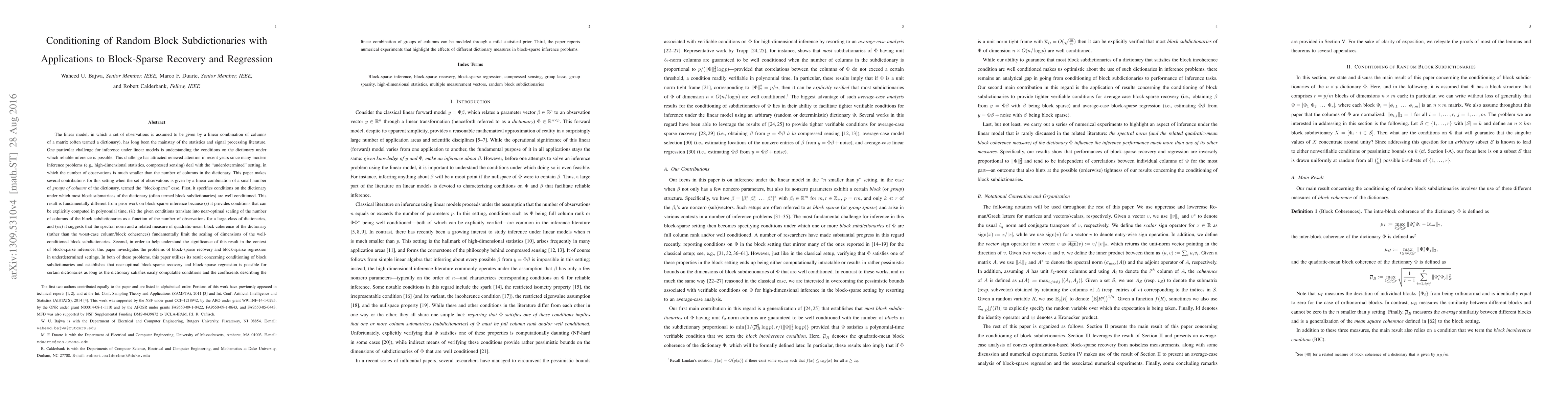 This paper specifies conditions for well-conditioned random block subdictionaries in underdetermined linear models, providing computable criteria for optimal scaling of block subdictionaries. It also explores block-sparse recovery and regression under these conditions, demonstrating near-optimal performance when dictionary conditions are met and coefficients follow a mild statistical model.