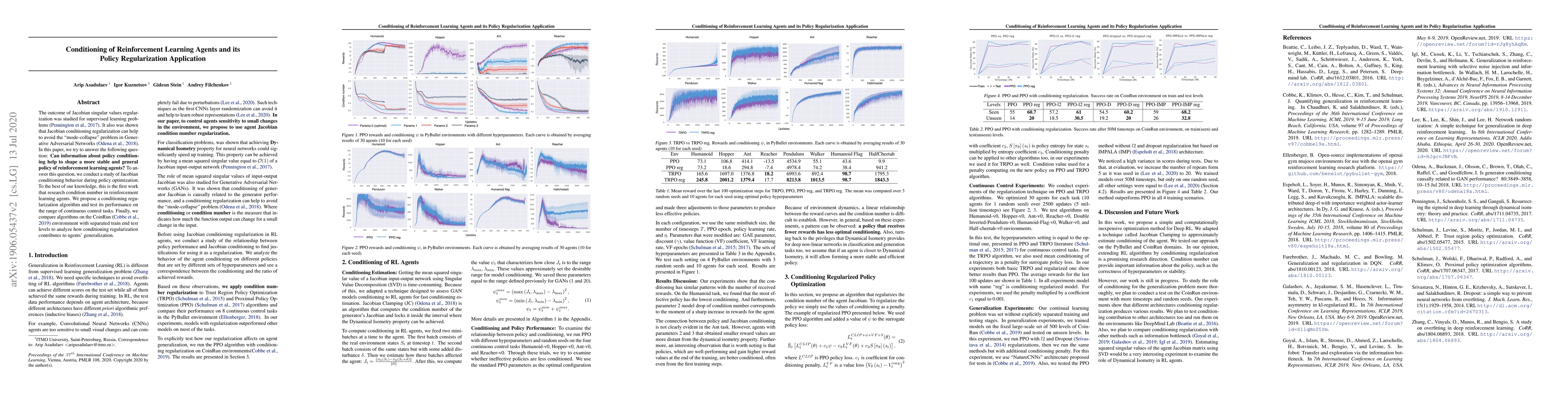 The outcome of Jacobian singular values regularization was studied for supervised learning problems. It also was shown that Jacobian conditioning regularization can help to avoid the ``mode-collapse'' problem in Generative Adversarial Networks. In this paper, we try to answer the following question: Can information about policy conditioning help to shape a more stable and general policy of reinforcement learning agents? To answer this question, we conduct a study of Jacobian conditioning behavior during policy optimization. To the best of our knowledge, this is the first work that research condition number in reinforcement learning agents. We propose a conditioning regularization algorithm and test its performance on the range of continuous control tasks. Finally, we compare algorithms on the CoinRun environment with separated train end test levels to analyze how conditioning regularization contributes to agents' generalization.