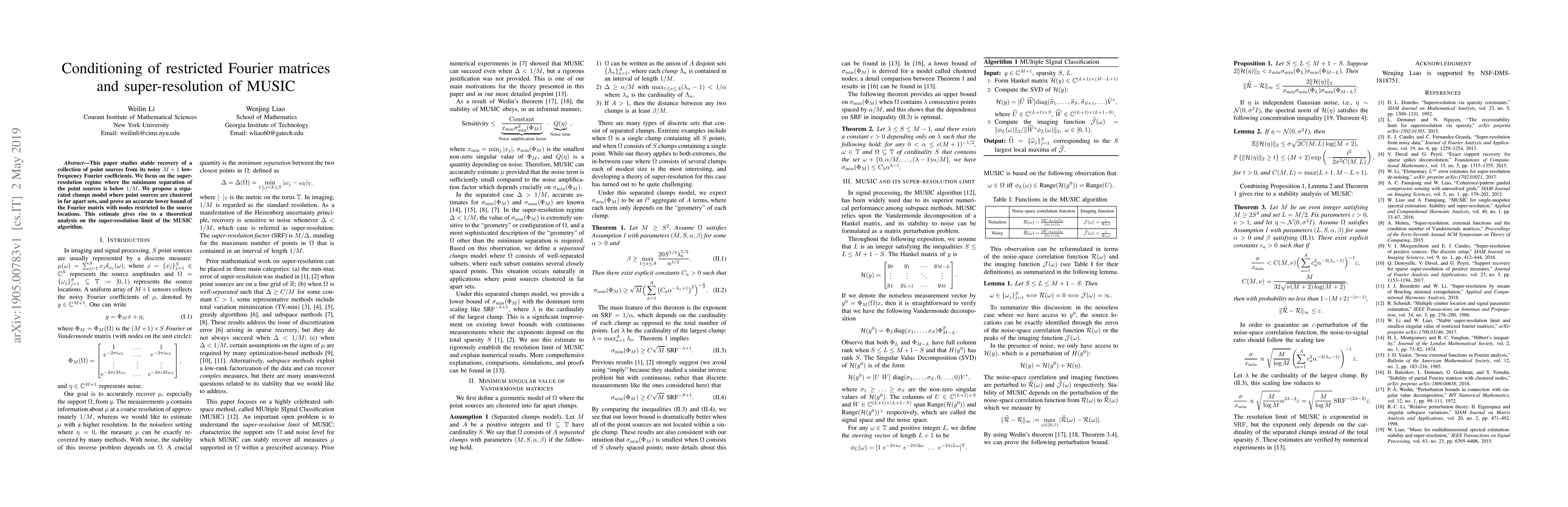 This paper investigates the stable recovery of point sources using their noisy low-frequency Fourier coefficients, focusing on the super-resolution regime. It proposes a separated clumps model and proves a lower bound for the restricted Fourier matrix, providing theoretical insights into the super-resolution limit of the MUSIC algorithm.