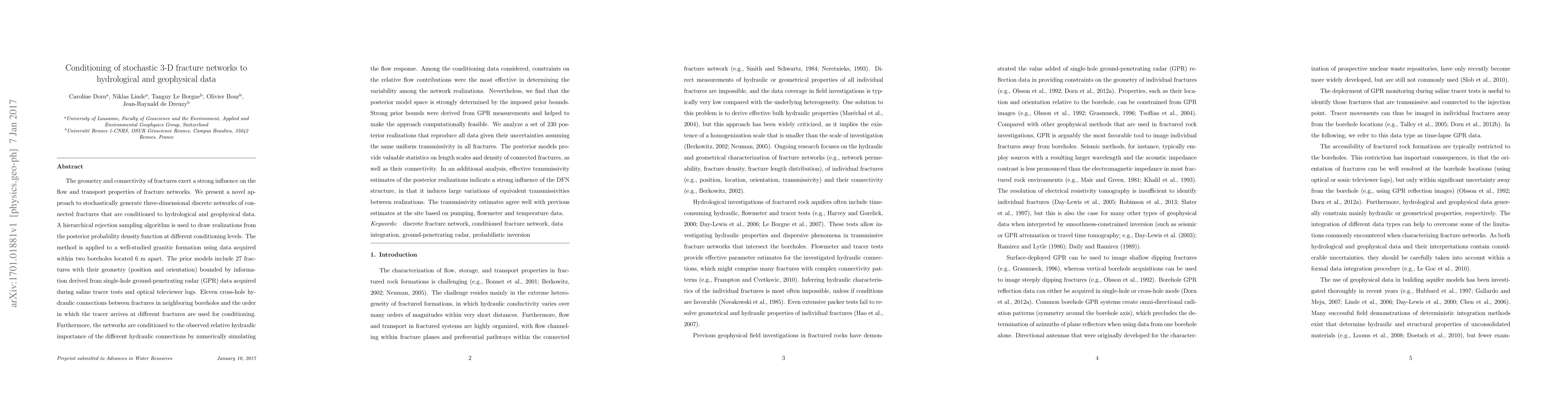 This paper introduces a method for generating stochastic 3-D fracture networks conditioned to hydrological and geophysical data, using a hierarchical rejection sampling algorithm. The approach is applied to a granitic formation, demonstrating the influence of prior bounds derived from GPR and hydraulic data on the resulting fracture networks.