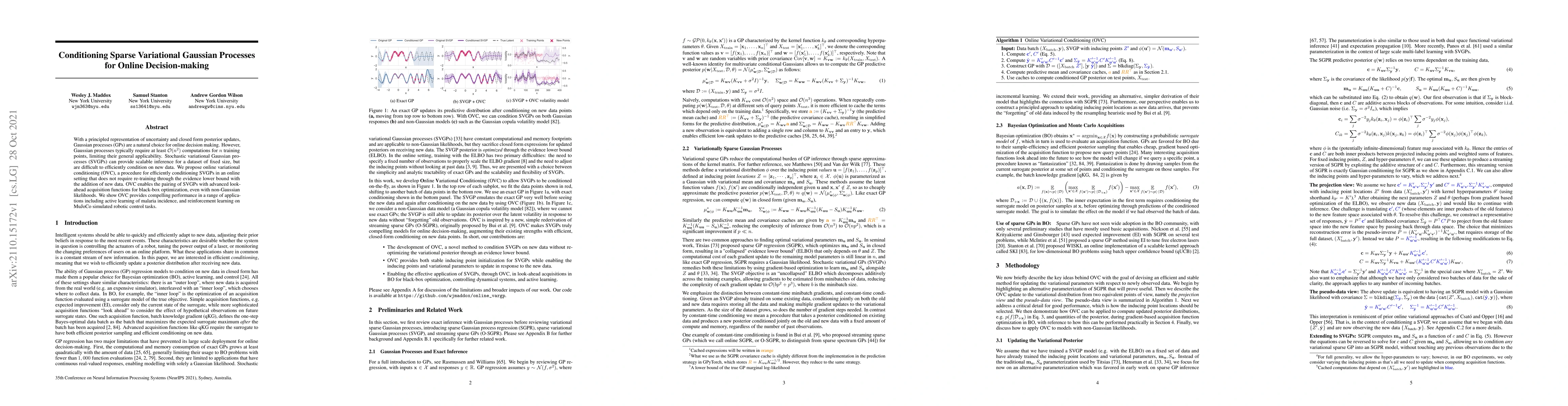 This paper proposes online variational conditioning (OVC) to efficiently update stochastic variational Gaussian processes (SVGPs) in an online setting without re-training, enabling scalable online decision-making and optimization. OVC demonstrates effective performance in applications like active learning and reinforcement learning.