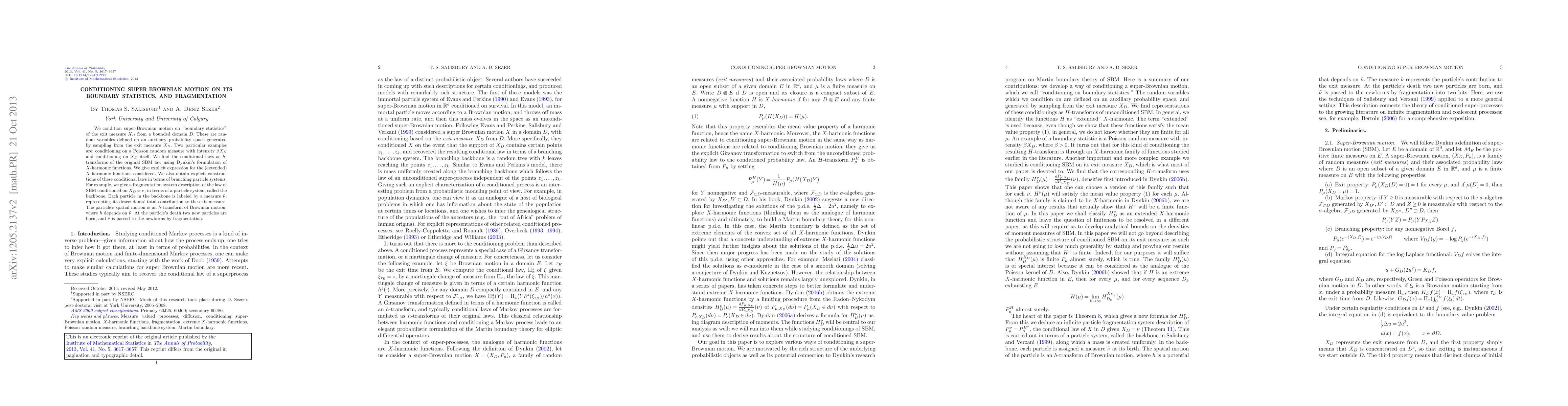 We condition super-Brownian motion on "boundary statistics" of the exit measure $X_D$ from a bounded domain $D$. These are random variables defined on an auxiliary probability space generated by sampling from the exit measure $X_D$. Two particular examples are: conditioning on a Poisson random measure with intensity $\beta X_D$ and conditioning on $X_D$ itself. We find the conditional laws as $h$-transforms of the original SBM law using Dynkin's formulation of $X$-harmonic functions. We give explicit expression for the (extended) $X$-harmonic functions considered. We also obtain explicit constructions of these conditional laws in terms of branching particle systems. For example, we give a fragmentation system description of the law of SBM conditioned on $X_D=\nu$, in terms of a particle system, called the backbone. Each particle in the backbone is labeled by a measure $\tilde{\nu}$, representing its descendants' total contribution to the exit measure. The particle's spatial motion is an $h$-transform of Brownian motion, where $h$ depends on $\tilde{\nu}$. At the particle's death two new particles are born, and $\tilde{\nu}$ is passed to the newborns by fragmentation.