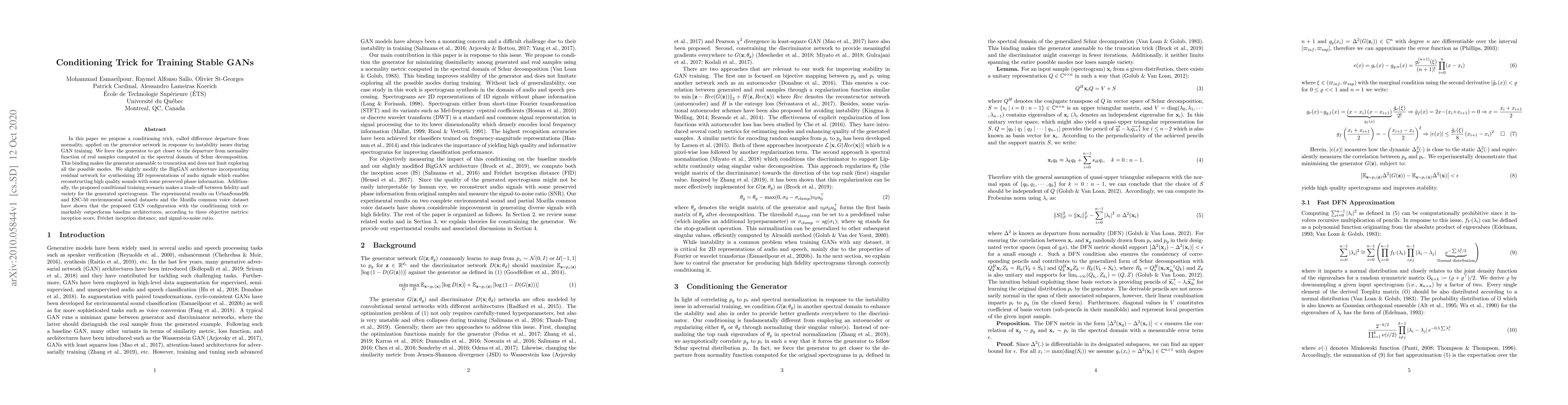 In this paper we propose a conditioning trick, called difference departure from normality, applied on the generator network in response to instability issues during GAN training. We force the generator to get closer to the departure from normality function of real samples computed in the spectral domain of Schur decomposition. This binding makes the generator amenable to truncation and does not limit exploring all the possible modes. We slightly modify the BigGAN architecture incorporating residual network for synthesizing 2D representations of audio signals which enables reconstructing high quality sounds with some preserved phase information. Additionally, the proposed conditional training scenario makes a trade-off between fidelity and variety for the generated spectrograms. The experimental results on UrbanSound8k and ESC-50 environmental sound datasets and the Mozilla common voice dataset have shown that the proposed GAN configuration with the conditioning trick remarkably outperforms baseline architectures, according to three objective metrics: inception score, Frechet inception distance, and signal-to-noise ratio.