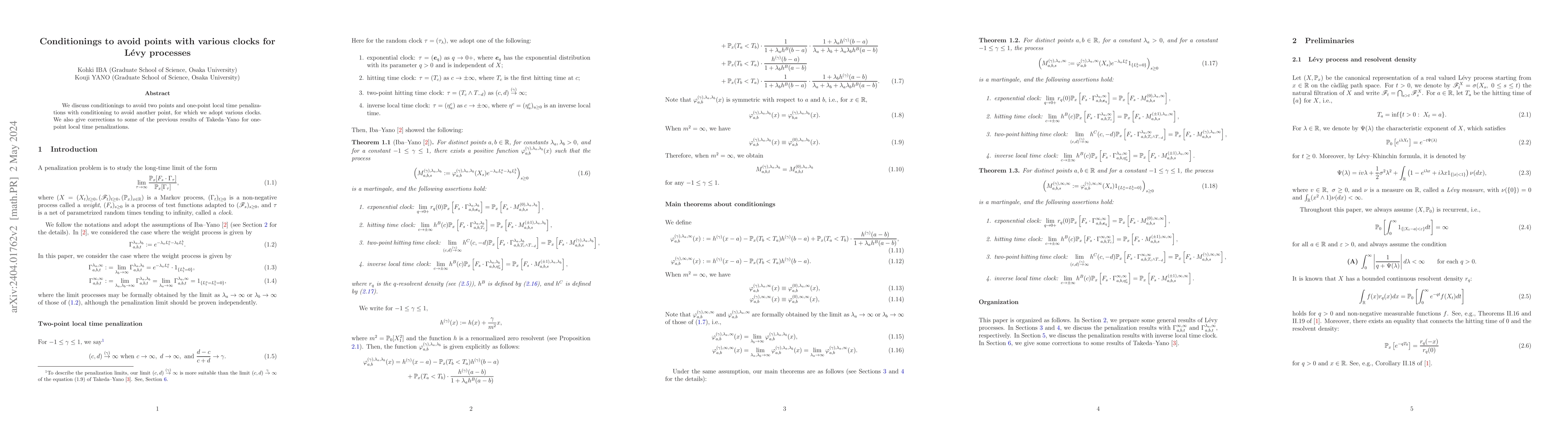 We discuss conditionings to avoid two points and one-point local time penalizations with conditioning to avoid another point, for which we adopt various clocks. We also give corrections to some of the previous results of Takeda--Yano for one-point local time penalizations.