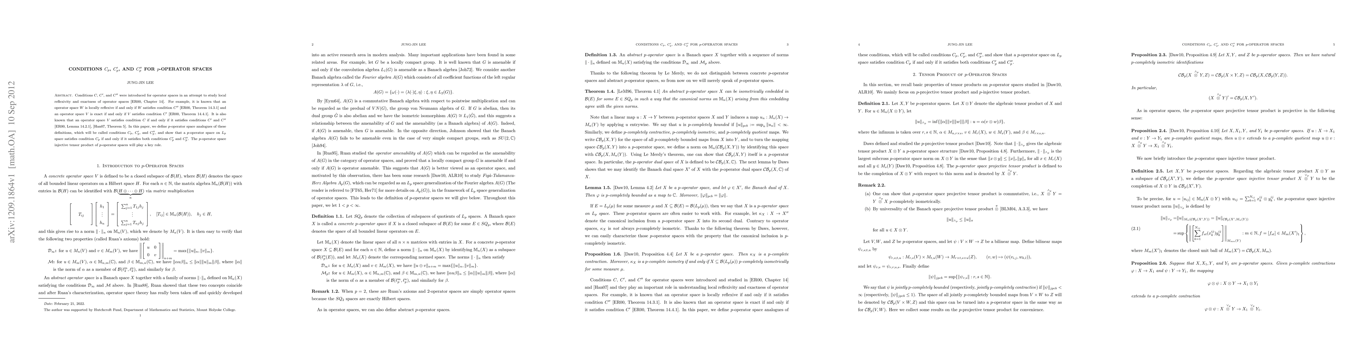 Conditions $C$, $C'$, and $C"$ were introduced for operator spaces in an attempt to study local reflexivity and exactness of operator spaces (Effros and Ruan, 2000). For example, it is known that an operator space $W$ is locally reflexive if and only if $W$ satisfies condition $C"$ (Effros and Ruan, 2000) and an operator space $V$ is exact if and only if $V$ satisfies condition $C'$ (Effros and Ruan, 2000). It is also known that an operator space $V$ satisfies condition $C$ if and only if it satisfies conditions $C'$ and $C"$ (Effros and Ruan, 2000, and Han, 2007). In this paper, we define $p$-operator space analogues of these definitions, which will be called conditions $C_p$, $C'_p$, and $C"_p$, and show that a $p$-operator space on $L_p$ space satisfies condition $C_p$ if and only if it satisfies both conditions $C'_p$ and $C"_p$. The $p$-operator space injective tensor product of $p$-operator spaces will play a key role.