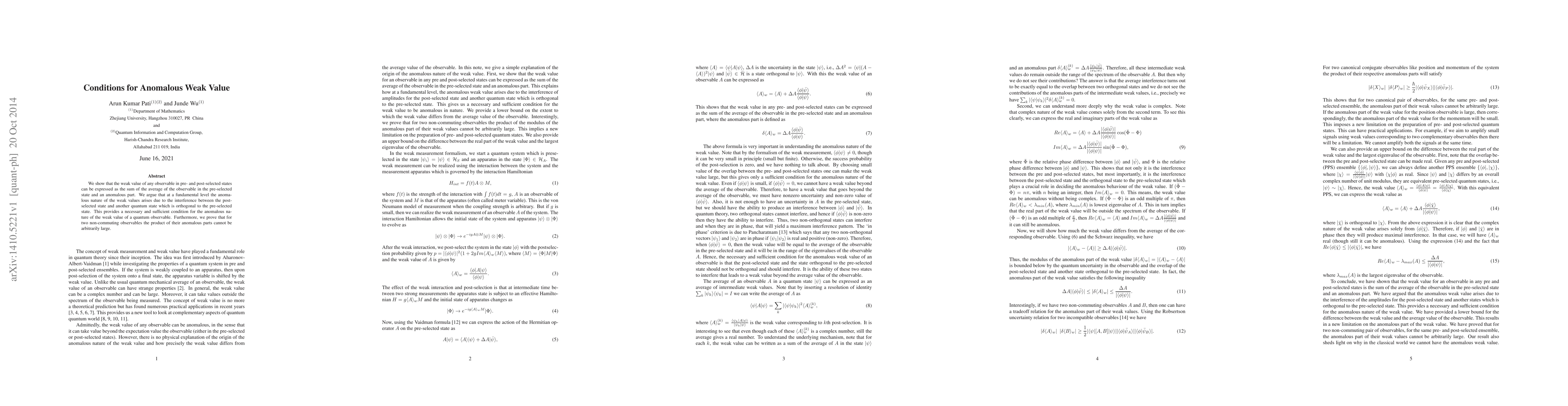 This paper establishes conditions for the anomalous weak value of quantum observables, revealing that it arises from interference between post-selected and orthogonal quantum states. It also proves a limit on the product of anomalous parts for non-commuting observables.