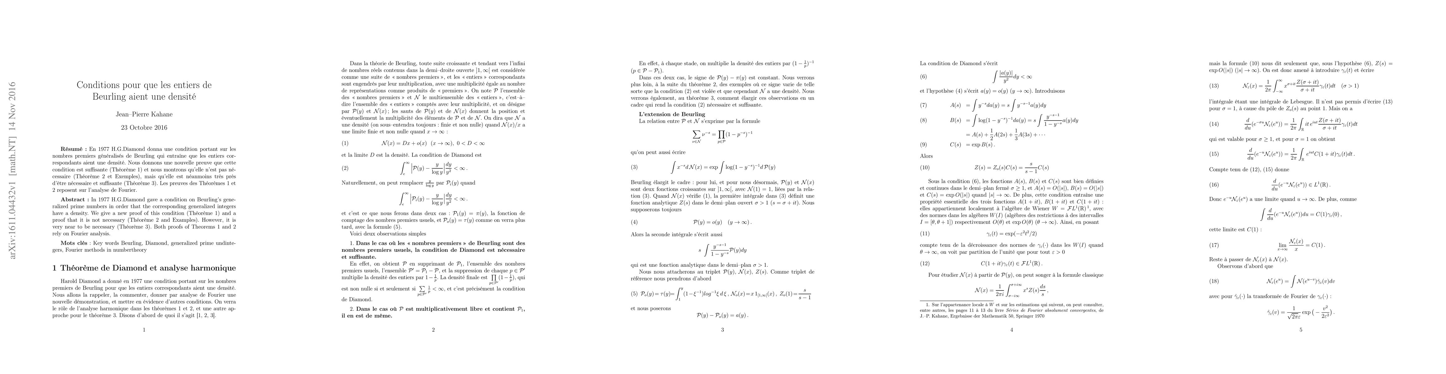 In 1997 H.G.Diamond gave a condition on Beurling's generalized prime numbers in order that the corresponding generalized integers have a density. We give a new proof of this condition (Theorem 1) and a proof that it is not necessary (Theorem 2 and Examples). However, it is very near to be necessary (Theorem 3). Both proofs of Theorems 1 and 2 rely on Fourier analysis, mainly the Wiener algebra, and partly on probability methods.