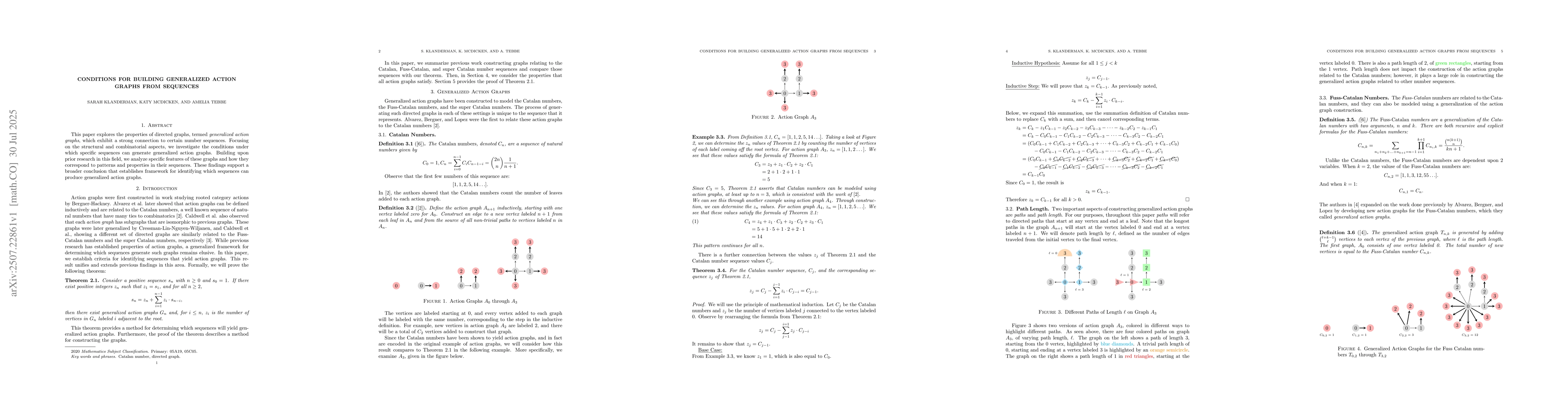 The paper presents Theorem 2.1, which provides sufficient conditions for constructing generalized action graphs from sequences, and proves the existence of such graphs for Fuss-Catalan and super Catalan numbers under certain conditions.