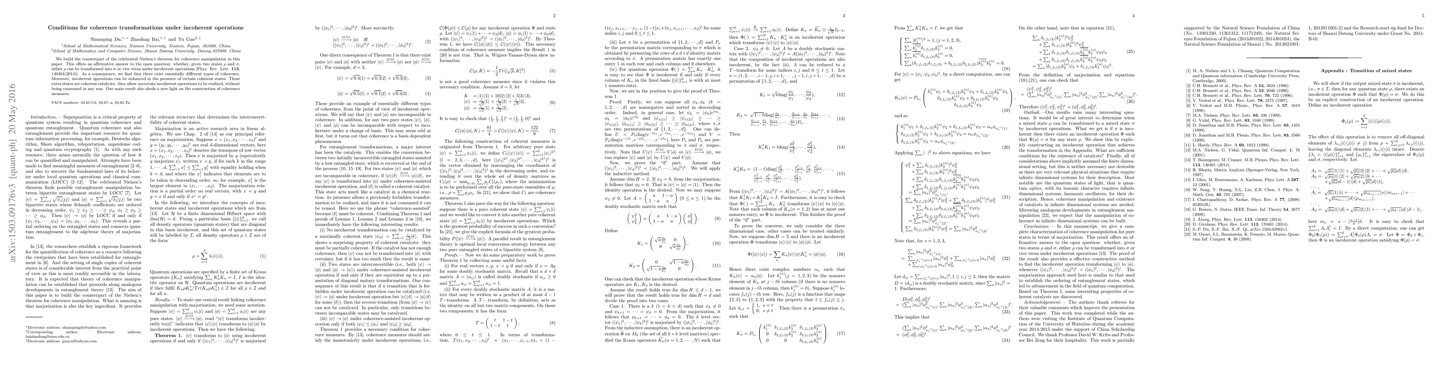 The paper establishes a Nielsen-like theorem for coherence manipulation under incoherent operations, providing necessary conditions for coherence measures and identifying coherent catalysts.