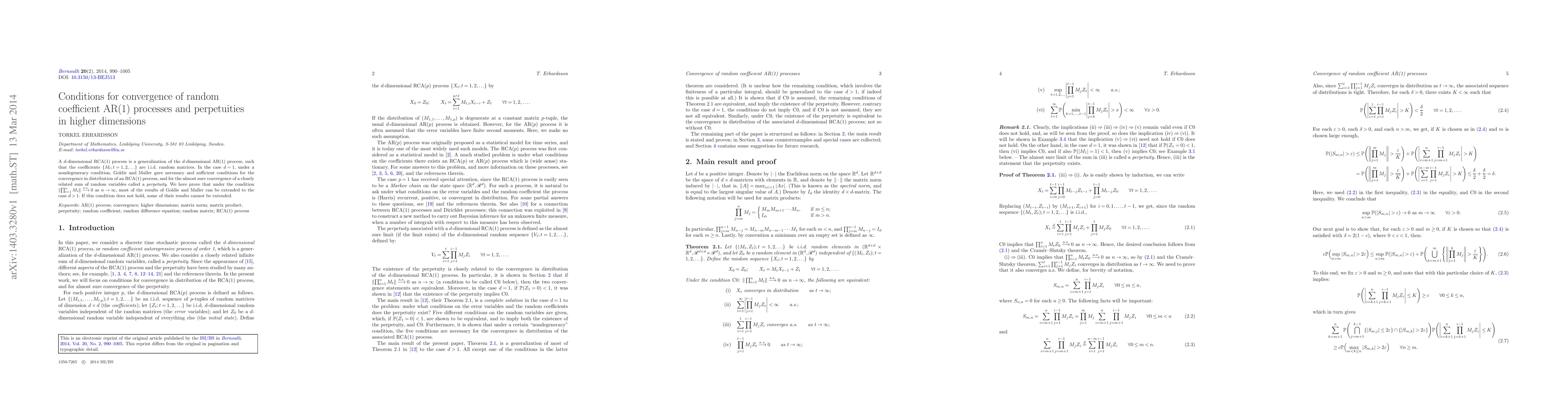 A $d$-dimensional RCA(1) process is a generalization of the $d$-dimensional AR(1) process, such that the coefficients $\{M_t;t=1,2,\ldots\}$ are i.i.d. random matrices. In the case $d=1$, under a nondegeneracy condition, Goldie and Maller gave necessary and sufficient conditions for the convergence in distribution of an RCA(1) process, and for the almost sure convergence of a closely related sum of random variables called a perpetuity. We here prove that under the condition $\Vert {\prod_{t=1}^nM_t}\Vert \stackrel{\mathrm{a.s.}}{\longrightarrow}0$ as $n\to\infty$, most of the results of Goldie and Maller can be extended to the case $d>1$. If this condition does not hold, some of their results cannot be extended.