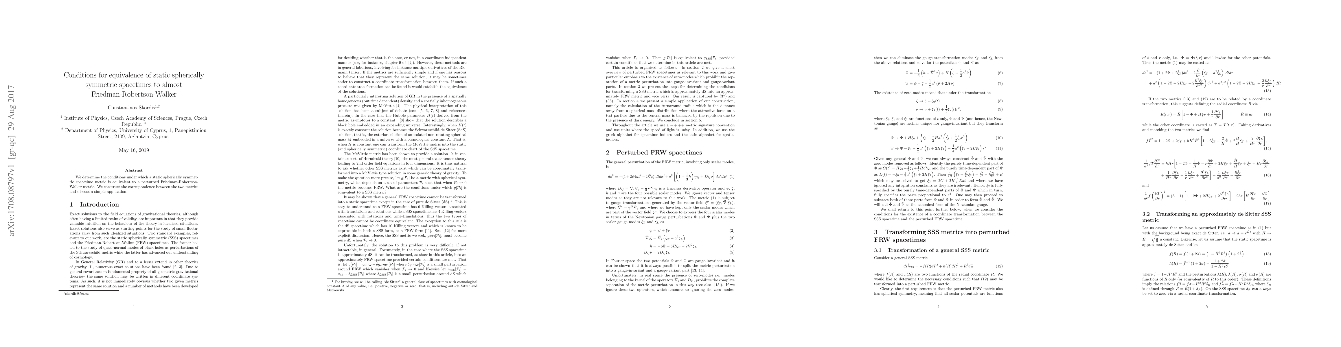 This paper identifies conditions for a static spherically symmetric spacetime to be equivalent to a perturbed Friedman-Robertson-Walker metric, establishing a correspondence between the two and demonstrating a straightforward application.