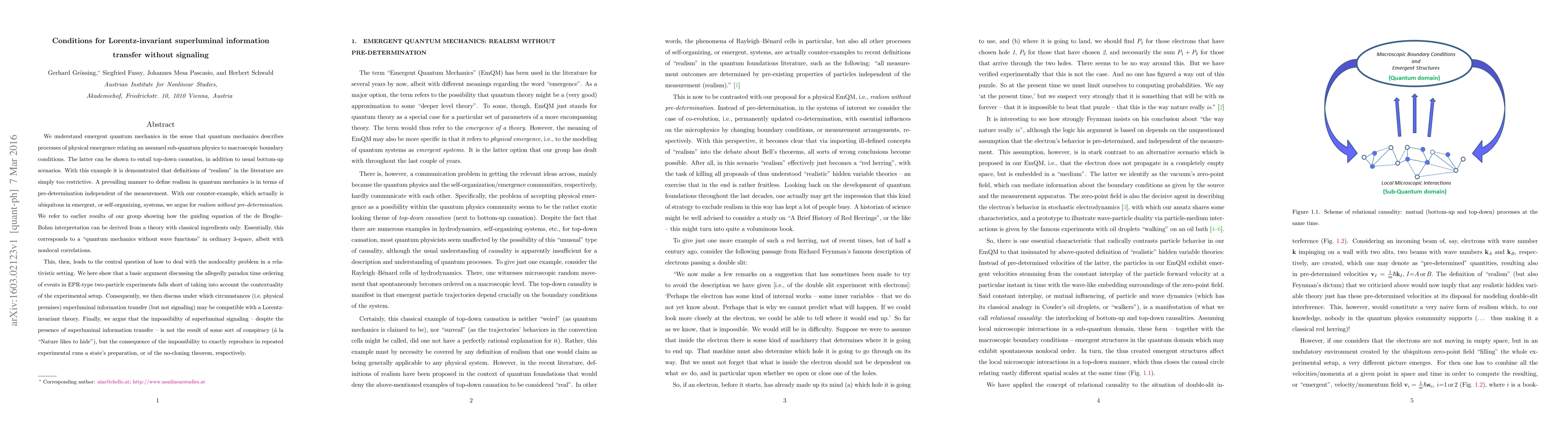 We understand emergent quantum mechanics in the sense that quantum mechanics describes processes of physical emergence relating an assumed sub-quantum physics to macroscopic boundary conditions. The latter can be shown to entail top-down causation, in addition to usual bottom-up scenarios. With this example it is demonstrated that definitions of "realism" in the literature are simply too restrictive. A prevailing manner to define realism in quantum mechanics is in terms of pre-determination independent of the measurement. With our counter-example, which actually is ubiquitous in emergent, or self-organizing, systems, we argue for realism without pre-determination. We refer to earlier results of our group showing how the guiding equation of the de Broglie-Bohm interpretation can be derived from a theory with classical ingredients only. Essentially, this corresponds to a "quantum mechanics without wave functions" in ordinary 3-space, albeit with nonlocal correlations. This, then, leads to the central question of how to deal with the nonlocality problem in a relativistic setting. We here show that a basic argument discussing the allegedly paradox time ordering of events in EPR-type two-particle experiments falls short of taking into account the contextuality of the experimental setup. Consequently, we then discuss under which circumstances (i.e. physical premises) superluminal information transfer (but not signaling) may be compatible with a Lorentz-invariant theory. Finally, we argue that the impossibility of superluminal signaling - despite the presence of superluminal information transfer - is not the result of some sort of conspiracy (a la "Nature likes to hide"), but the consequence of the impossibility to exactly reproduce in repeated experimental runs a state's preparation, or of the no-cloning theorem, respectively.