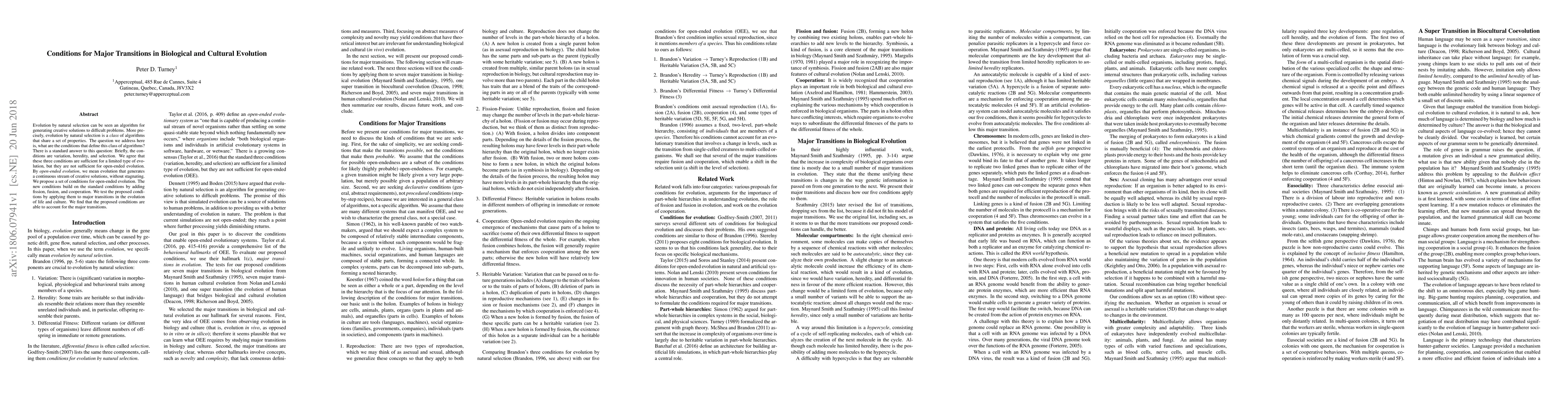 Evolution by natural selection can be seen an algorithm for generating creative solutions to difficult problems. More precisely, evolution by natural selection is a class of algorithms that share a set of properties. The question we address here is, what are the conditions that define this class of algorithms? There is a standard answer to this question: Briefly, the conditions are variation, heredity, and selection. We agree that these three conditions are sufficient for a limited type of evolution, but they are not sufficient for open-ended evolution. By open-ended evolution, we mean evolution that generates a continuous stream of creative solutions, without stagnating. We propose a set of conditions for open-ended evolution. The new conditions build on the standard conditions by adding fission, fusion, and cooperation. We test the proposed conditions by applying them to major transitions in the evolution of life and culture. We find that the proposed conditions are able to account for the major transitions.