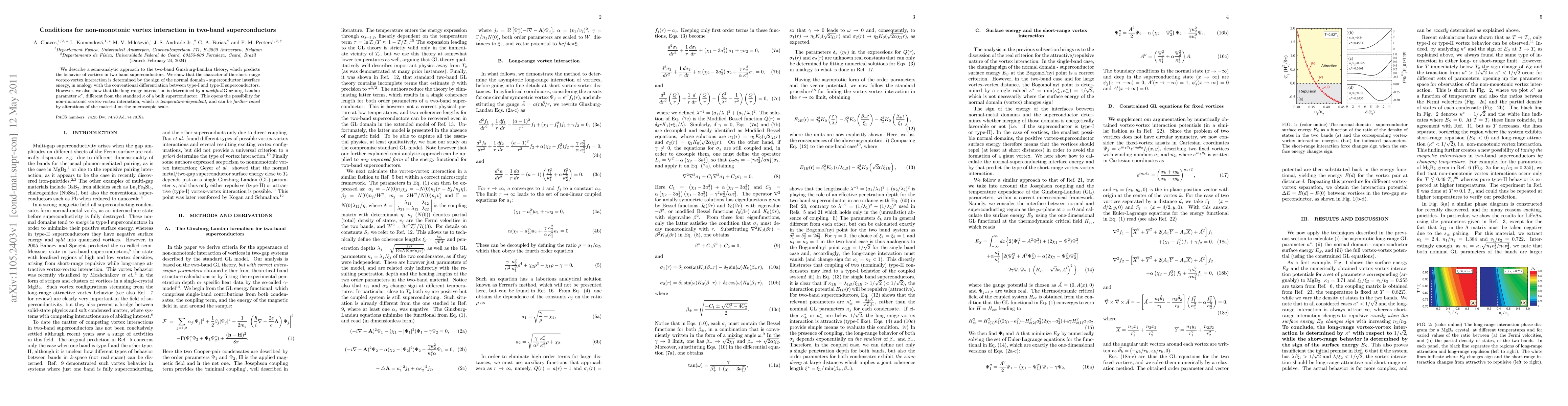 Summary: The study presents a semi-analytic method for two-band superconductors, revealing that short-range vortex interactions are influenced by the normal domain-superconductor interface energy, while long-range interactions depend on a modified Ginzburg-Landau parameter $\kappa^*$. This leads to temperature-dependent, tunable non-monotonic vortex interactions.