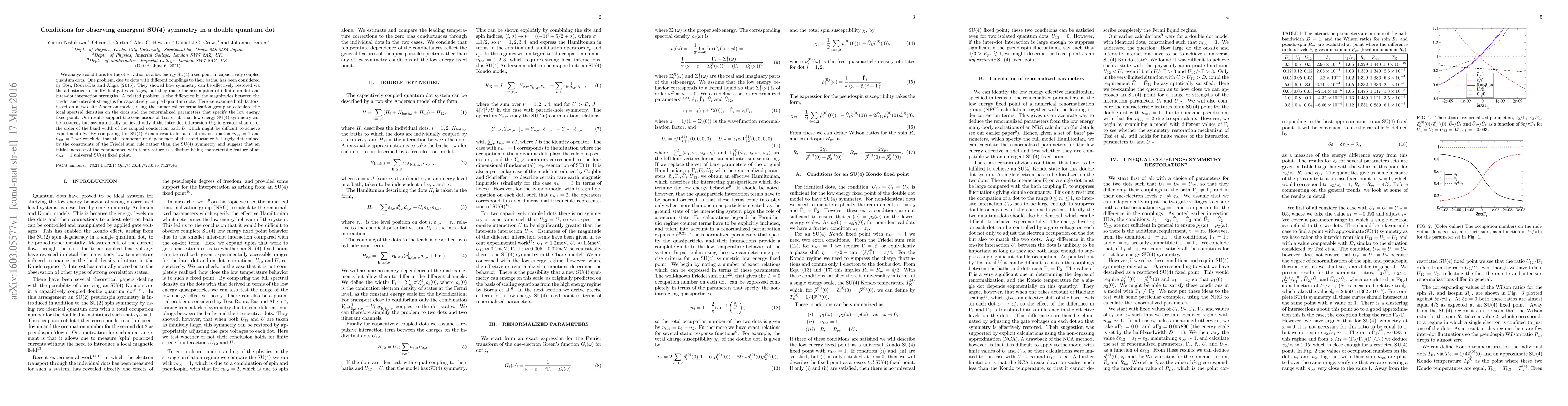This research analyzes conditions for observing SU(4) symmetry in capacitively coupled quantum dots. Using a two-site Anderson model and numerical renormalization group, it finds that low energy SU(4) symmetry can be restored asymptotically if inter-dot interaction U12 is greater than or comparable to the bandwidth of the coupled conduction bath D. The study suggests that temperature dependence of conductance is mainly influenced by Friedel sum rule constraints, with an initial conductance increase at higher temperatures being a distinct feature of an n_tot=1 universal SU(4) fixed point.