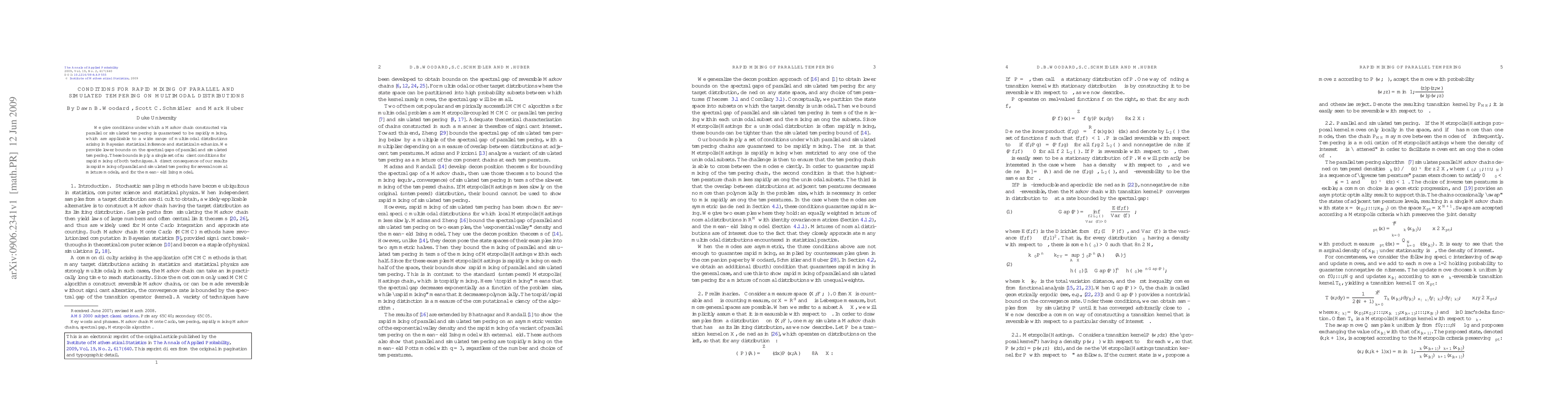 This paper establishes conditions for rapid mixing in Markov chains using parallel and simulated tempering methods, applicable to multimodal distributions in Bayesian inference and statistical mechanics. It provides lower bounds on spectral gaps, leading to a unified set of sufficient conditions for both techniques, ensuring rapid mixing for normal mixture models and the mean-field Ising model.