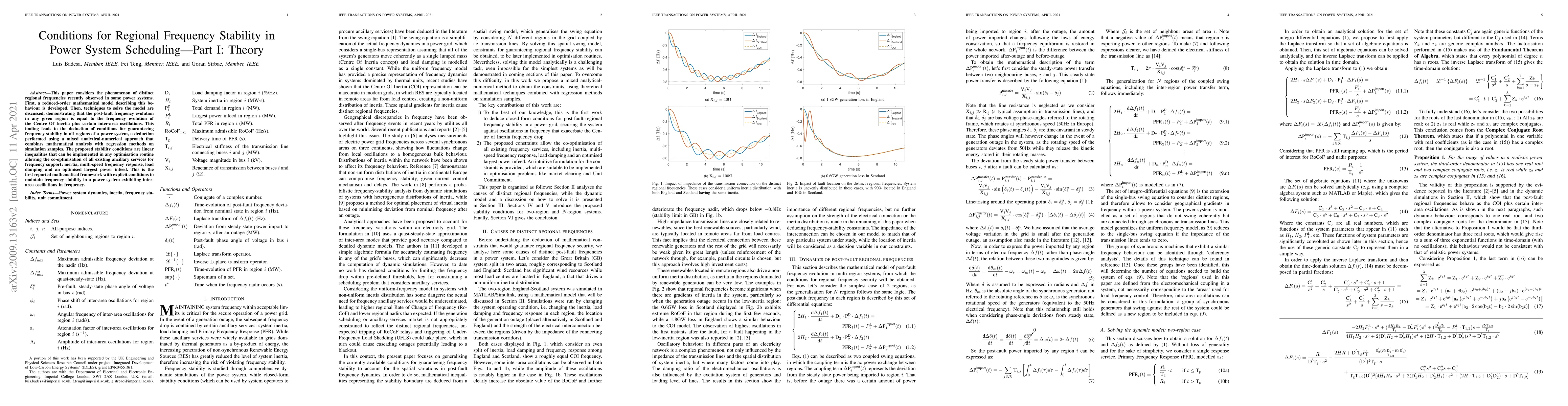 This paper develops a reduced-order mathematical model to explain distinct regional frequencies in power systems and proposes linear inequalities for ensuring frequency stability using a mixed analytical-numerical approach. The conditions allow for co-optimisation of various ancillary services for frequency support.