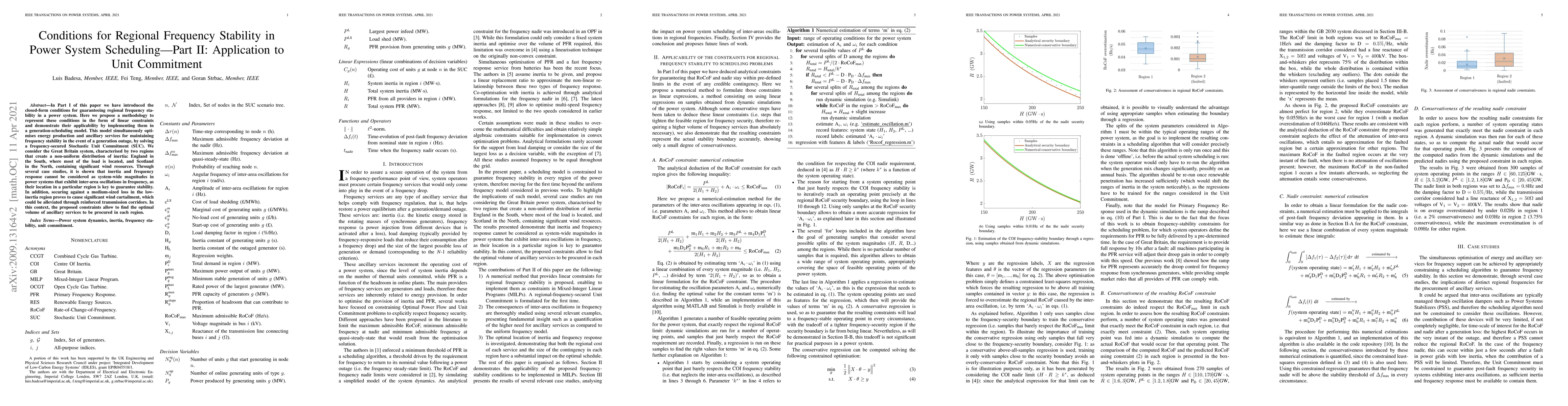 In Part I of this paper we have introduced the closed-form conditions for guaranteeing regional frequency stability in a power system. Here we propose a methodology to represent these conditions in the form of linear constraints and demonstrate their applicability by implementing them in a generation-scheduling model. This model simultaneously optimises energy production and ancillary services for maintaining frequency stability in the event of a generation outage, by solving a frequency-secured Stochastic Unit Commitment (SUC). We consider the Great Britain system, characterised by two regions that create a non-uniform distribution of inertia: England in the South, where most of the load is located, and Scotland in the North, containing significant wind resources. Through several case studies, it is shown that inertia and frequency response cannot be considered as system-wide magnitudes in power systems that exhibit inter-area oscillations in frequency, as their location in a particular region is key to guarantee stability. In addition, securing against a medium-sized loss in the low-inertia region proves to cause significant wind curtailment, which could be alleviated through reinforced transmission corridors. In this context, the proposed constraints allow to find the optimal volume of ancillary services to be procured in each region.