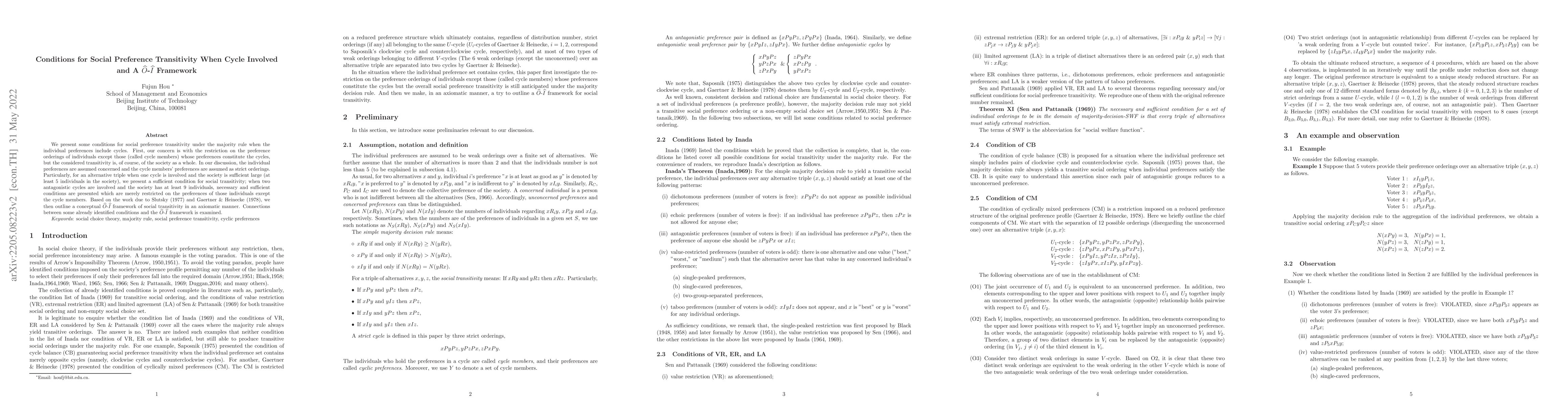 We present some conditions for social preference transitivity under the majority rule when the individual preferences include cycles. First, our concern is with the restriction on the preference orderings of individuals except those (called cycle members) whose preferences constitute the cycles, but the considered transitivity is, of course, of the society as a whole. In our discussion, the individual preferences are assumed concerned and the cycle members' preferences are assumed as strict orderings. Particularly, for an alternative triple when one cycle is involved and the society is sufficient large (at least 5 individuals in the society), we present a sufficient condition for social transitivity; when two antagonistic cycles are involved and the society has at least 9 individuals, necessary and sufficient conditions are presented which are merely restricted on the preferences of those individuals except the cycle members. Based on the work due to Slutsky (1977) and Gaertner \& Heinecke (1978), we then outline a conceptual $\hat{O}\mbox{-}\hat{I}$ framework of social transitivity in an axiomatic manner. Connections between some already identified conditions and the $\hat{O}\mbox{-}\hat{I}$ framework is examined.
