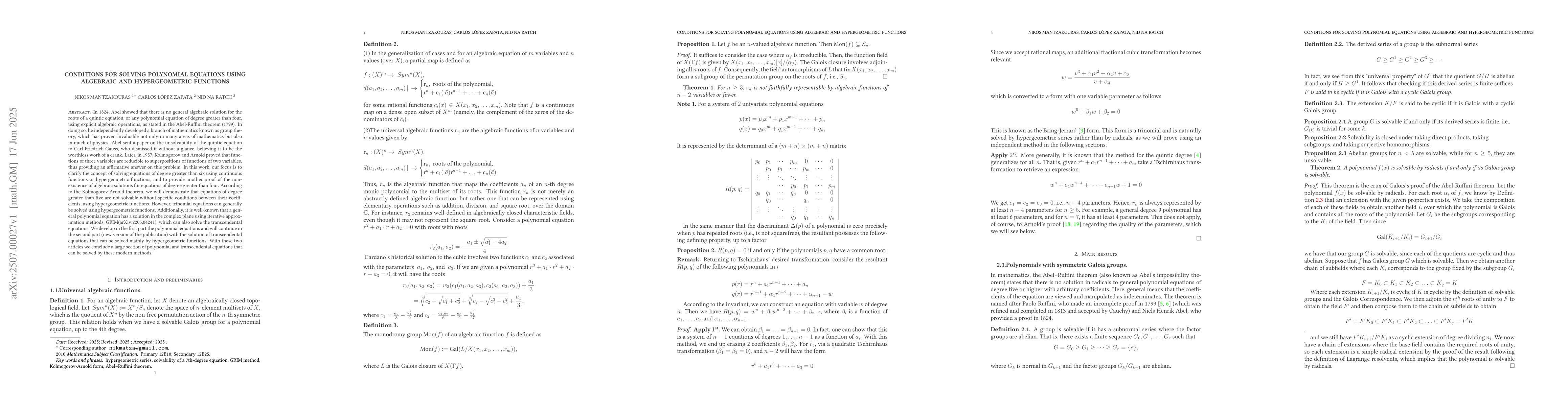 In this paper, we focus on clarifying the concept of solving equations of degree greater than six using continuous functions or hypergeometric functions and providing another proof of the non-existence of algebraic solutions for equations of degree greater than four. According to the Kolmogorov-Arnold theorem, we will prove that equations of degree greater than five cannot be solved without special conditions between their coefficients using hypergeometric functions. However, we prove that trinomial equations of general form can in general be solved using hypergeometric functions.