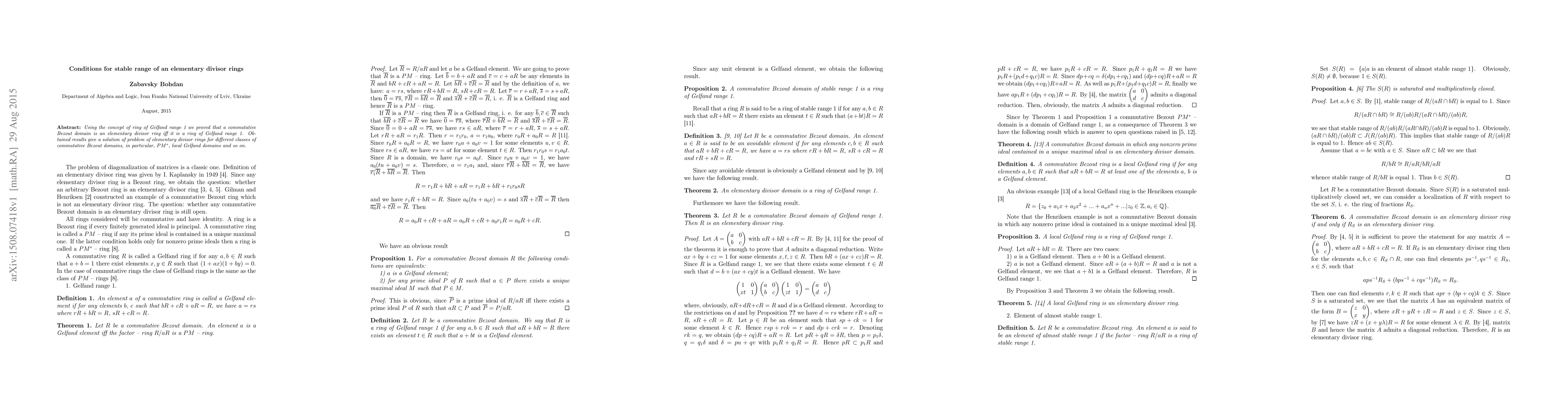 Using the concept of ring of Gelfand range 1 we proved that a commutative Bezout domain is an elementary divisor ring iff it is a ring of Gelfand range 1. Obtained results give a solution of problem of elementary divisor rings for different classes of commutative Bezout domains, in particular, $PM^{*}$, local Gelfand domains and so on.