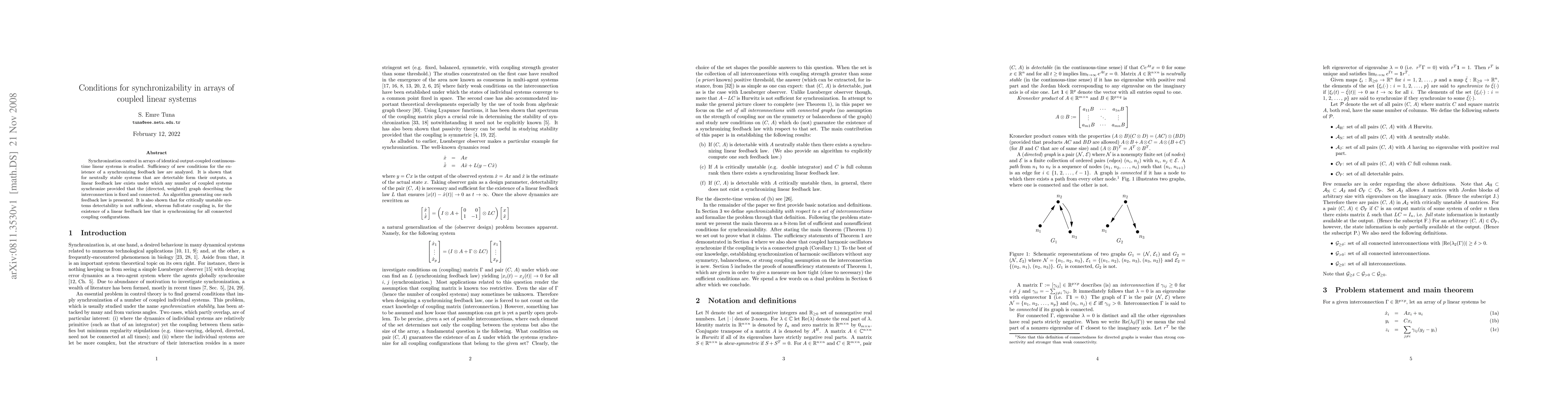 This paper investigates conditions for synchronizability in arrays of coupled linear systems, demonstrating that a linear feedback law can synchronize neutrally stable, output-detectable systems if the interconnection graph is fixed and connected. For critically unstable systems, full-state coupling is necessary for synchronization, rather than mere detectability.