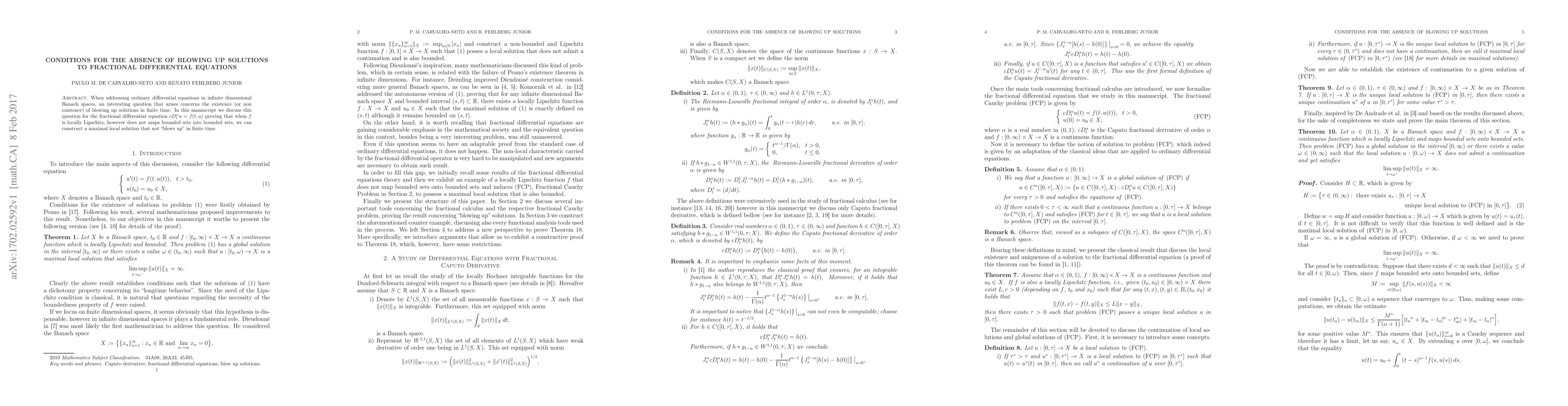 This paper investigates the conditions under which fractional differential equations do not exhibit blowing up solutions in finite time. It proves that if the function $f$ is locally Lipschitz but does not map bounded sets into bounded sets, a maximal local solution can be constructed that does not blow up in finite time.