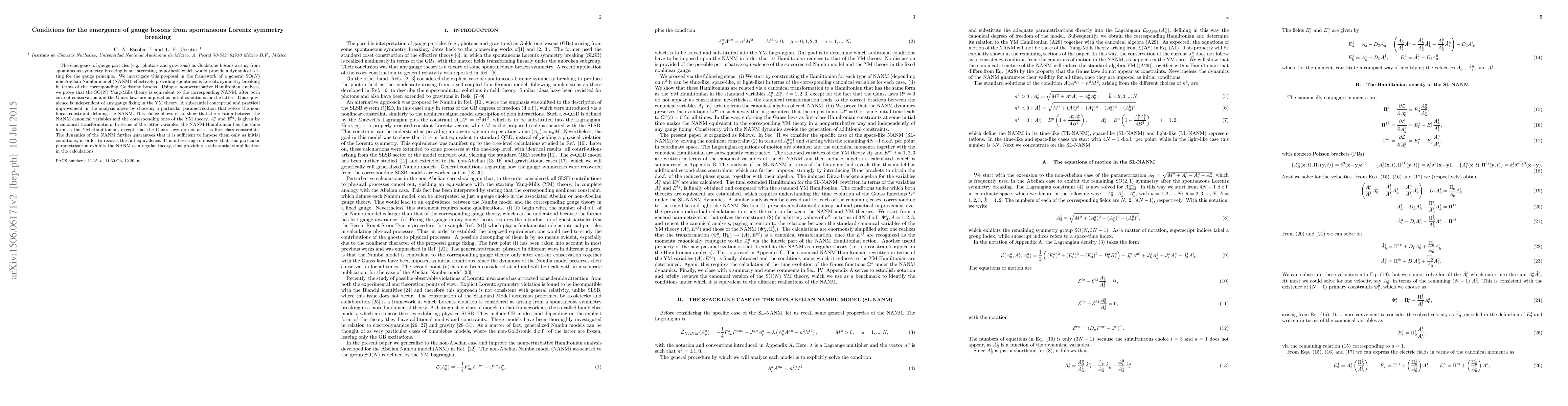 The emergence of gauge particles (e.g., photons and gravitons) as Goldstone bosons arising from spontaneous symmetry breaking is an interesting hypothesis which would provide a dynamical setting for the gauge principle. We investigate this proposal in the framework of a general $% SO(N)$ non-abelian Nambu model (NANM), effectively providing spontaneous Lorentz symmetry breaking in terms of the corresponding Goldstone bosons. Using a non-perturbative Hamiltonian analysis, we prove that the $SO(N)$ Yang--Mills theory is equivalent to the corresponding NANM, after current conservation together with the Gauss laws are imposed as initial conditions for the latter. This equivalence is independent of any gauge fixing in the YM theory. A substantial conceptual and practical improvement in the analysis arises by choosing a particular parametrization that solves the non-linear constraint defining the NANM. This choice allows us to show that the relation between the NANM canonical variables and the corresponding ones of the YM theory, $A_{i}^{a}$ and $E^{bj}$, is given by a canonical transformation. In terms of the latter variables, the NANM Hamiltonian has the same form as the YM Hamiltonian, except that the Gauss laws do not arise as first class constraints. The dynamics of the NANM further guarantees that it is sufficient to impose them only as initial conditions, in order to recover the full equivalence. It is interesting to observe that this particular parametrization exhibits the NANM as a regular theory, thus providing a substantial simplification in the calculations.