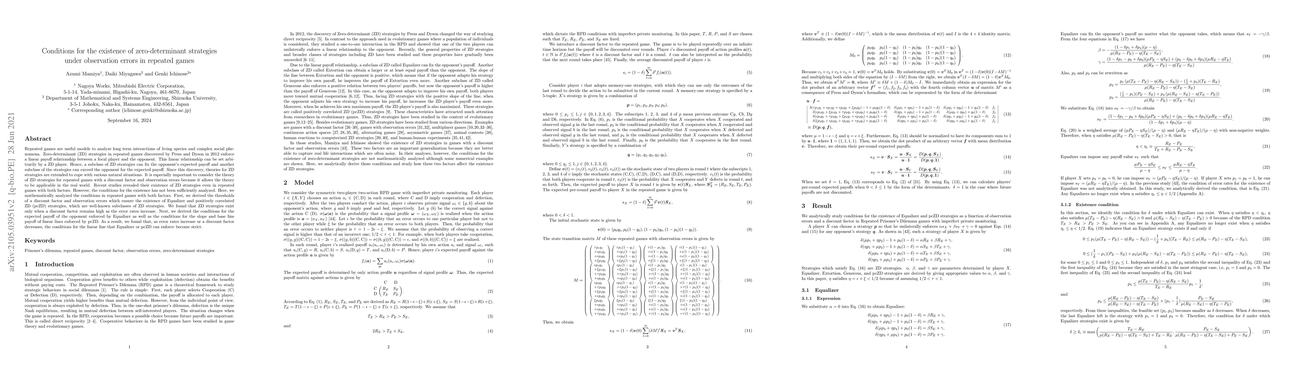 This research mathematically analyzes conditions for Zero-Determinant (ZD) strategies' existence in repeated games with observation errors and a discount factor, finding that ZD strategies persist with high discount factors as error rates rise. It derives thresholds for a discount factor and observation errors for Equalizer and positively correlated ZD (pcZD) strategies, and outlines how increasing error rates or decreasing discount factors make ZD strategy conditions stricter.