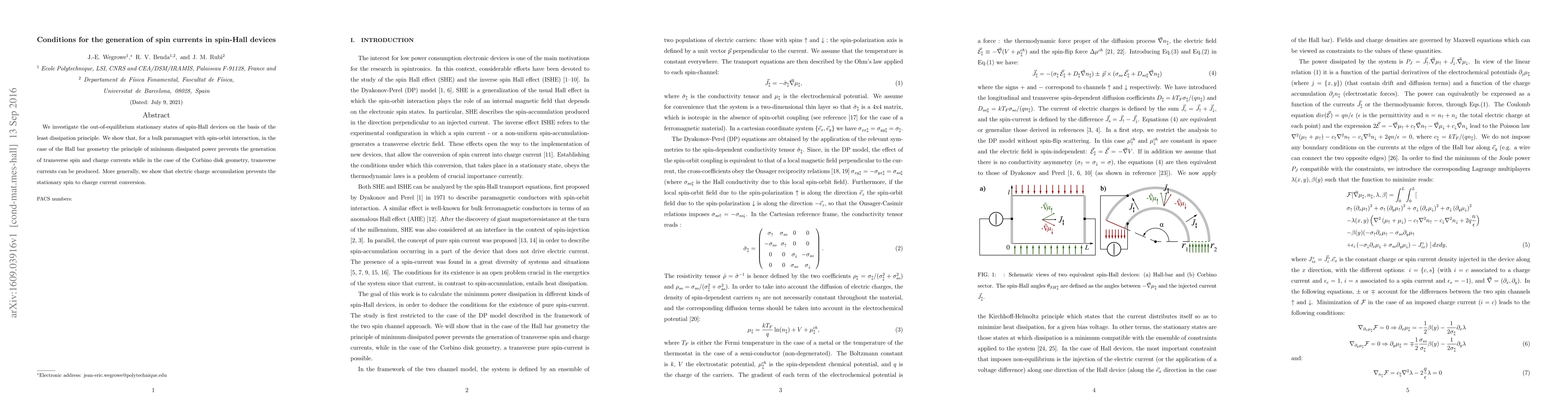 Research shows that spin-Hall devices can generate transverse spin currents in Corbino disk geometry but not in Hall bar geometry due to the least dissipation principle. Electric charge accumulation also prevents stationary spin-charge current conversion.