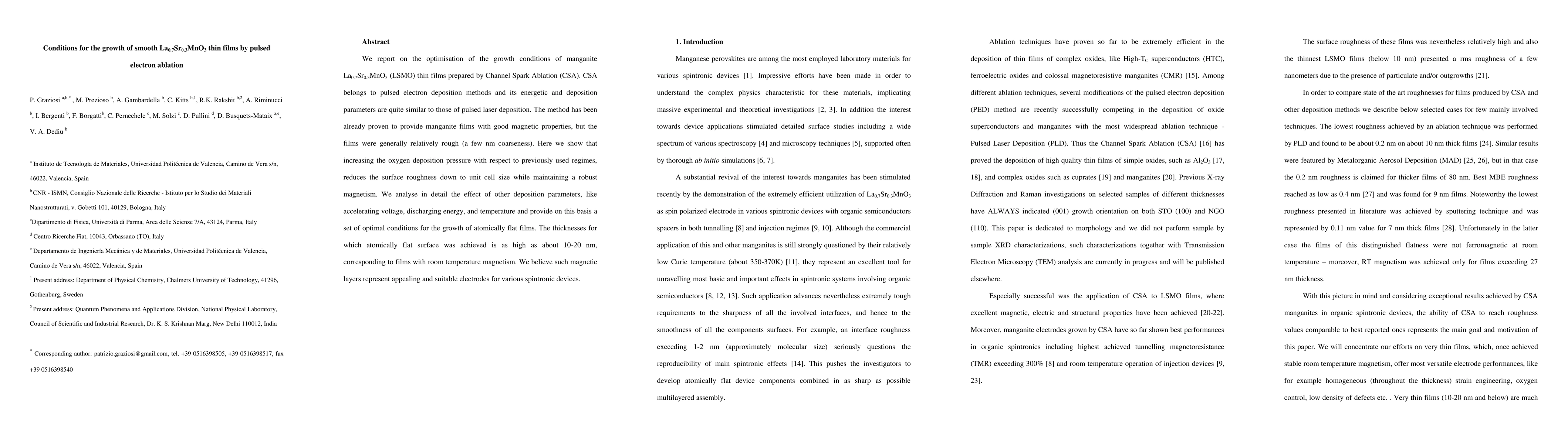 This study optimizes the growth of smooth La0.7Sr0.3MnO3 (LSMO) thin films using Channel Spark Ablation, achieving atomically flat surfaces by adjusting oxygen deposition pressure and other parameters, while maintaining robust magnetic properties suitable for spintronic devices.