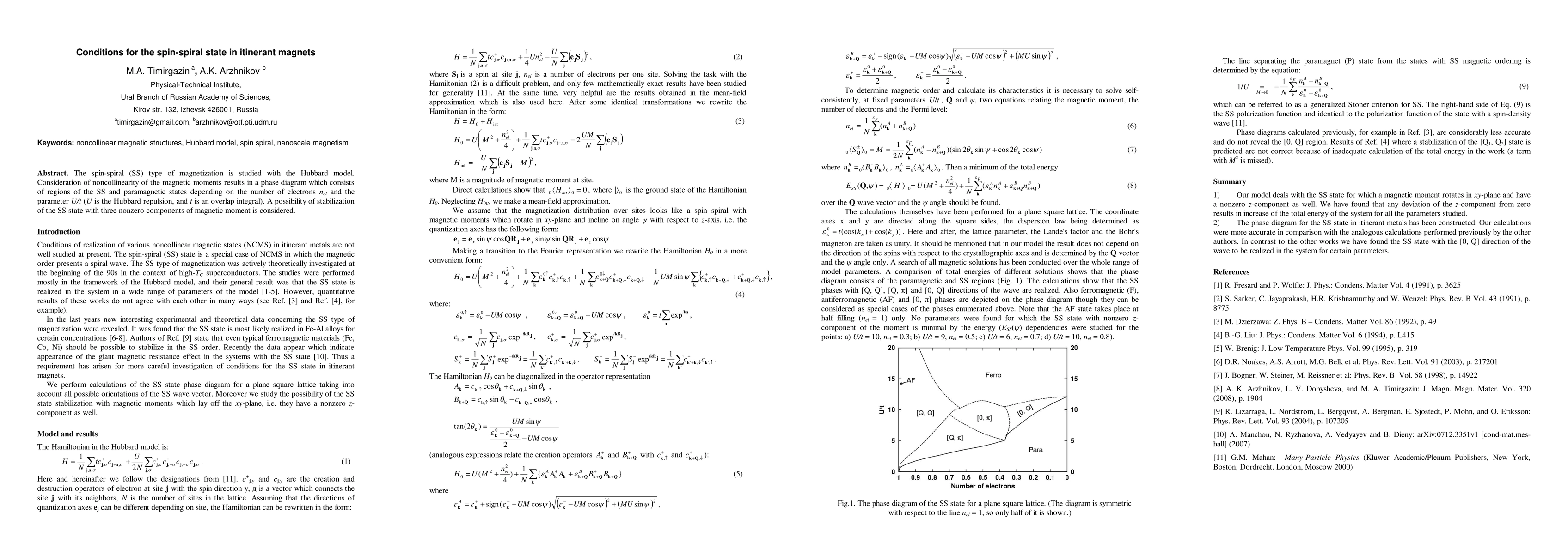 The spin-spiral (SS) type of magnetization is studied with the Hubbard model. Consideration of noncollinearity of the magnetic moments results in a phase diagram which consists of regions of the SS and paramagnetic states depending on the number of electrons and the parameter U/t (U is the Hubbard repulsion, and t is an overlap integral). A possibility of stabilization of the SS state with three nonzero components of magnetic moment is considered.