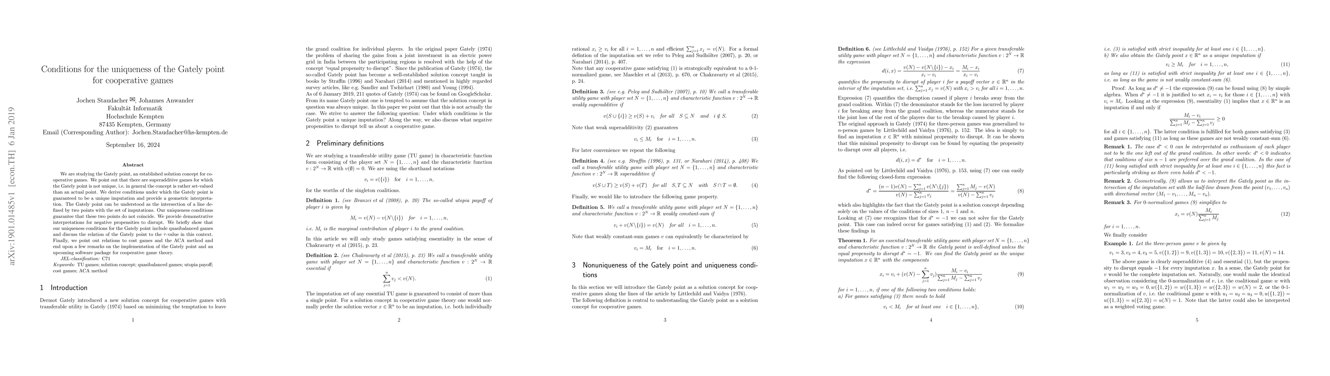 We are studying the Gately point, an established solution concept for cooperative games. We point out that there are superadditive games for which the Gately point is not unique, i.e. in general the concept is rather set-valued than an actual point. We derive conditions under which the Gately point is guaranteed to be a unique imputation and provide a geometric interpretation. The Gately point can be understood as the intersection of a line defined by two points with the set of imputations. Our uniqueness conditions guarantee that these two points do not coincide. We provide demonstrative interpretations for negative propensities to disrupt. We briefly show that our uniqueness conditions for the Gately point include quasibalanced games and discuss the relation of the Gately point to the $\tau$-value in this context. Finally, we point out relations to cost games and the ACA method and end upon a few remarks on the implementation of the Gately point and an upcoming software package for cooperative game theory.