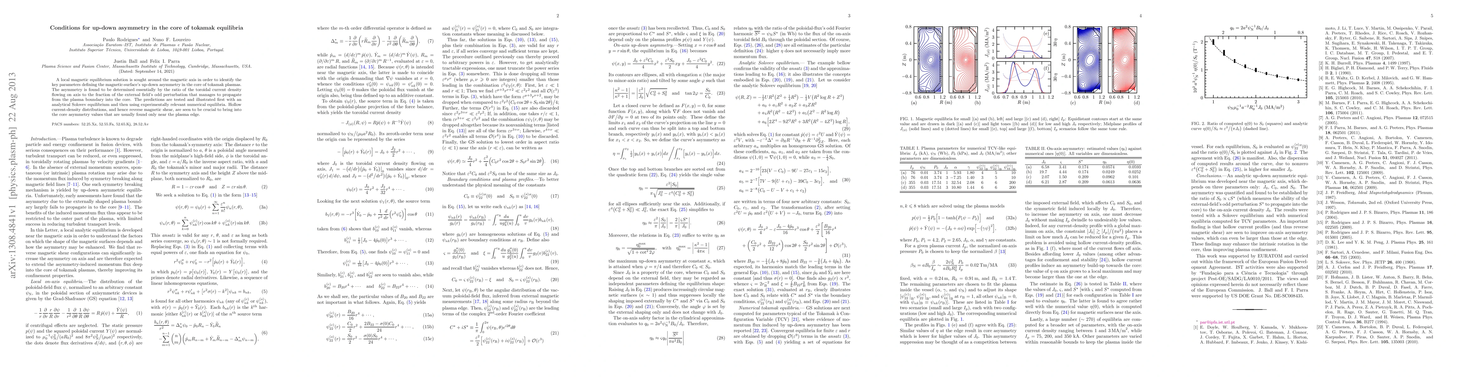 A local magnetic equilibrium solution is sought around the magnetic axis in order to identify the key parameters defining the magnetic-surface's up-down asymmetry in the core of tokamak plasmas. The asymmetry is found to be determined essentially by the ratio of the toroidal current density flowing on axis to the fraction of the external field's odd perturbation that manages to propagate from the plasma boundary into the core. The predictions are tested and illustrated first with an analytical Solovev equilibrium and then using experimentally relevant numerical equilibria. Hollow current-density distributions, and hence reverse magnetic shear, are seen to be crucial to bring into the core asymmetry values that are usually found only near the plasma edge.