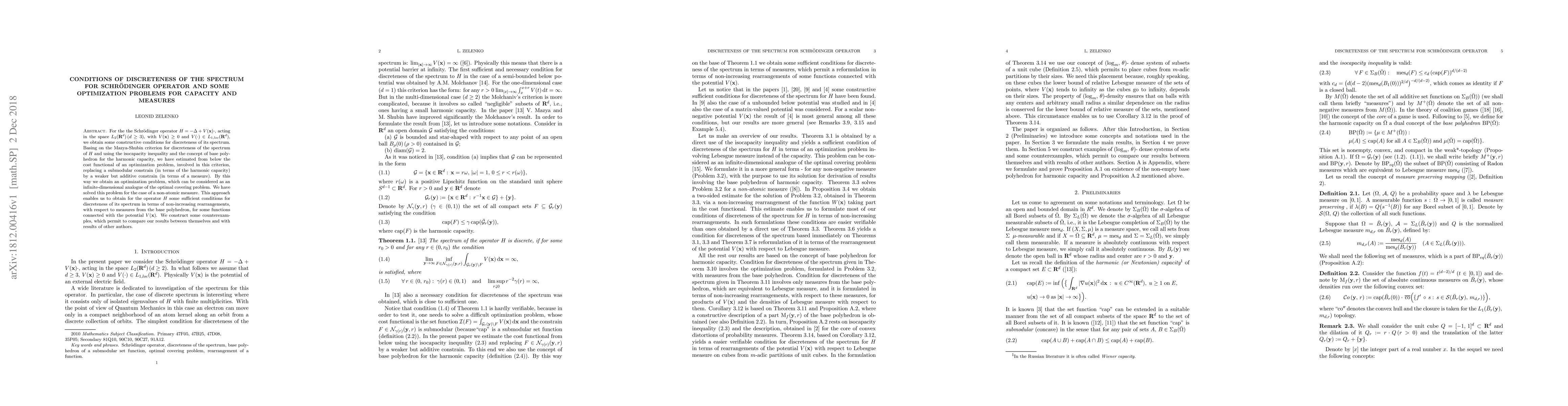 For the the Schr\"odinger operator $H=-\Delta+ V(x)\cdot$, acting in the space L_2(\R^d)\,(d\ge 3), with V(x)\ge 0 and V(\cdot)\in L_{1,loc}(\R^d), we obtain some constructive conditions for discreteness of its spectrum. Basing on the Mazya-Shubin criterion for discreteness of the spectrum of $H$ and using the isocapacity inequality and the concept of base polyhedron for the harmonic capacity, we have estimated from below the cost functional of an optimization problem, involved in this criterion, replacing a submodular constrain (in terms of the harmonic capacity) by a weaker but additive constrain (in terms of a measure). By this way we obtain an optimization problem, which can be considered as an infinite-dimensional analogue of the optimal covering problem. We have solved this problem for the case of a non-atomic measure. This approach enables us to obtain for the operator H some sufficient conditions for discreteness of its spectrum in terms of non-increasing rearrangements, with respect to measures from the base polyhedron, for some functions connected with the potential V(x). We construct some counterexamples, which permit to compare our results between themselves and with results of other authors.