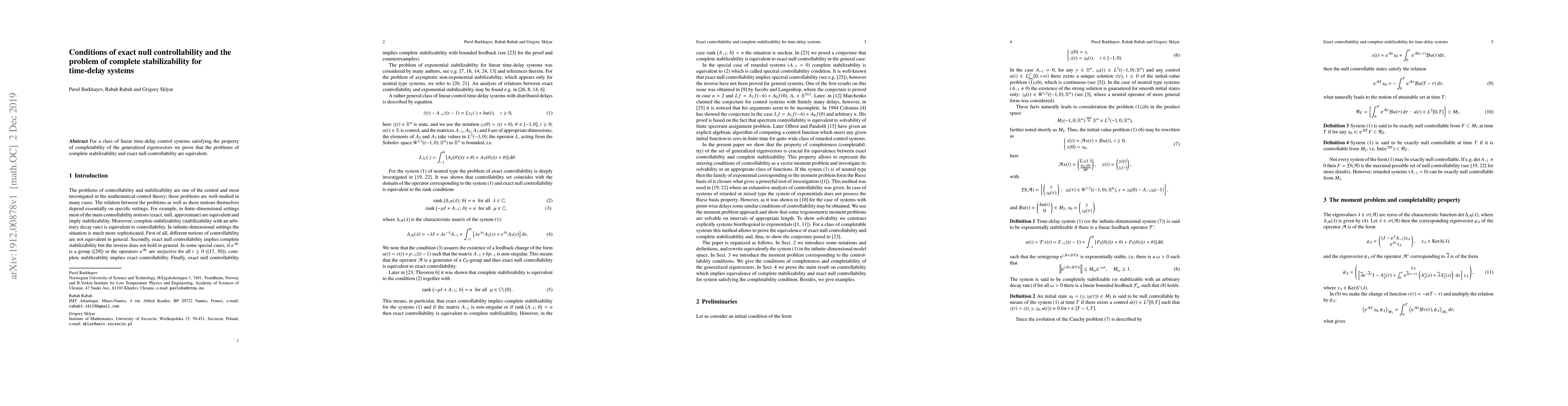 Summary: This paper proves that for a class of linear time-delay systems with completable generalized eigenvectors, complete stabilizability and exact null controllability are equivalent properties. The study establishes a direct link between the two concepts in the context of time-delay systems.