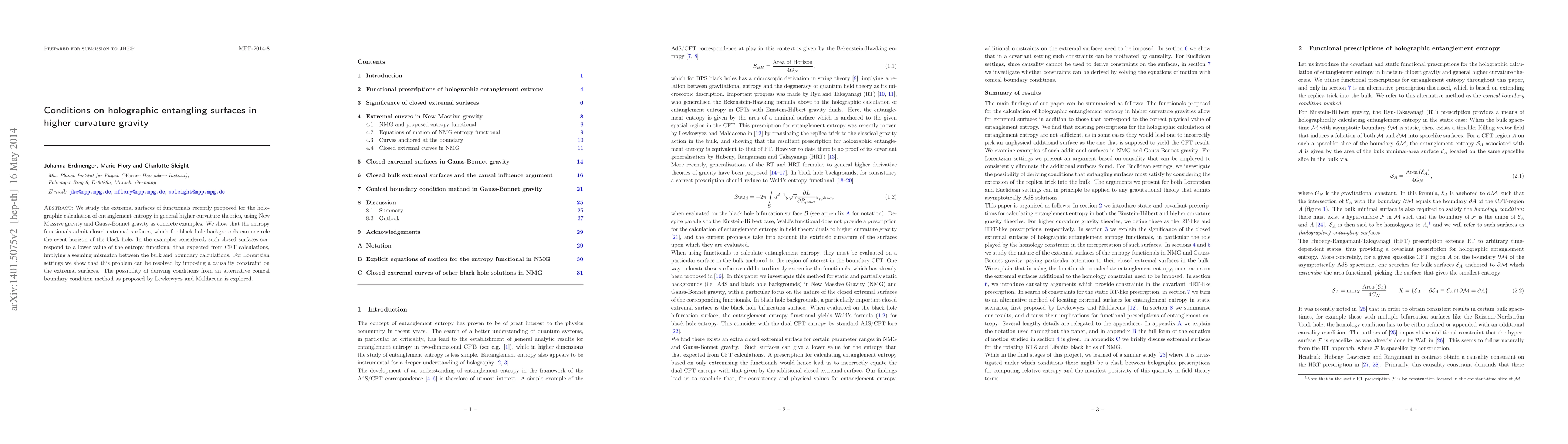 We study the extremal surfaces of functionals recently proposed for the holographic calculation of entanglement entropy in general higher curvature theories, using New Massive gravity and Gauss-Bonnet gravity as concrete examples. We show that the entropy functionals admit closed extremal surfaces, which for black hole backgrounds can encircle the event horizon of the black hole. In the examples considered, such closed surfaces correspond to a lower value of the entropy functional than expected from CFT calculations, implying a seeming mismatch between the bulk and boundary calculations. For Lorentzian settings we show that this problem can be resolved by imposing a causality constraint on the extremal surfaces. The possibility of deriving conditions from an alternative conical boundary condition method as proposed by Lewkowycz and Maldacena is explored.