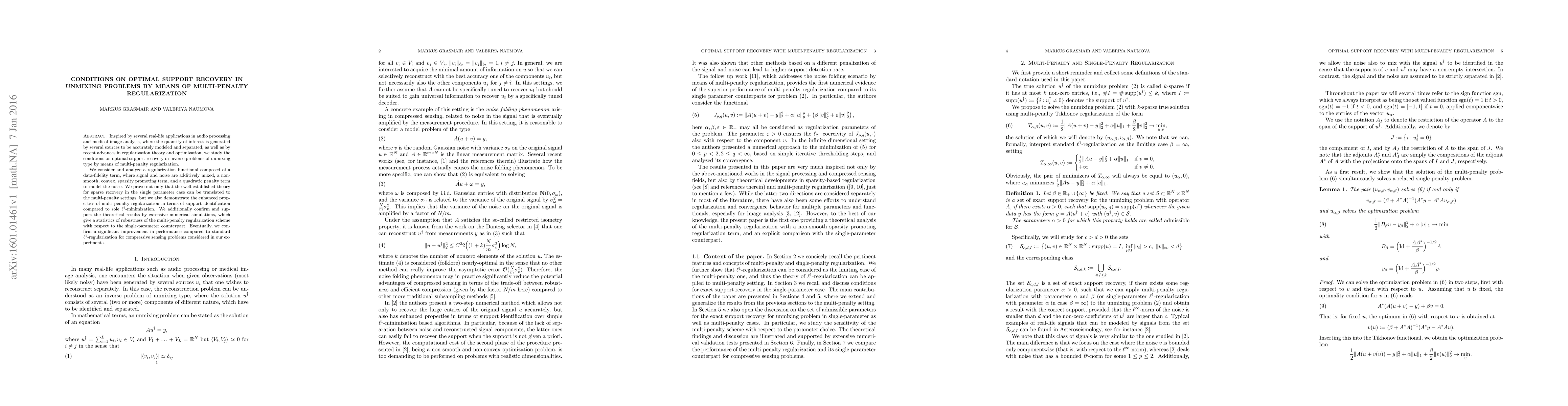 This paper investigates optimal support recovery in unmixing problems using multi-penalty regularization, demonstrating enhanced support identification compared to $\ell^1$-minimization. Theoretical proofs and numerical simulations show significant performance improvements for compressive sensing applications.