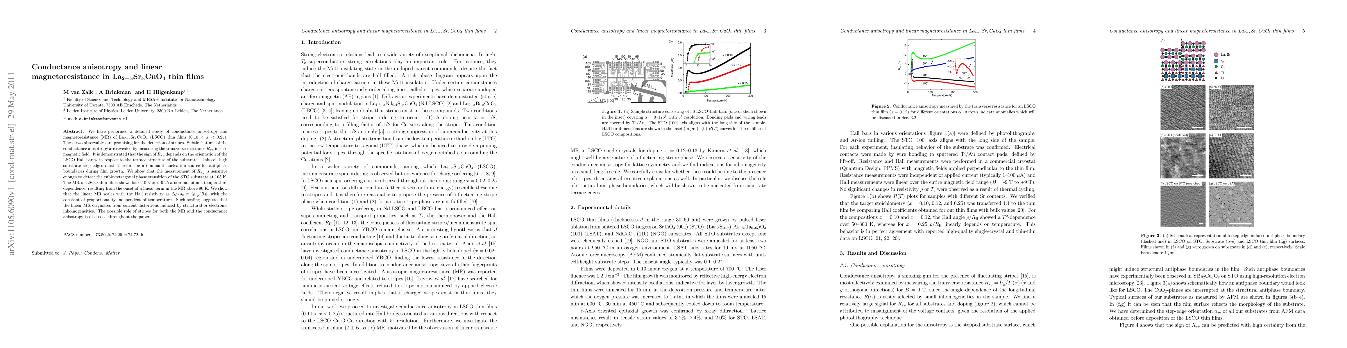 This study investigates conductance anisotropy and magnetoresistance in La2-xSrxCuO4 thin films, revealing that transverse resistance in zero magnetic field depends on film orientation relative to substrate terraces, indicating terrace edges as nucleation sites for antiphase boundaries. The linear magnetoresistance exhibits a non-monotonic temperature dependence, suggesting structural or electronic inhomogeneities, with the linear term scaling with Hall resistivity.