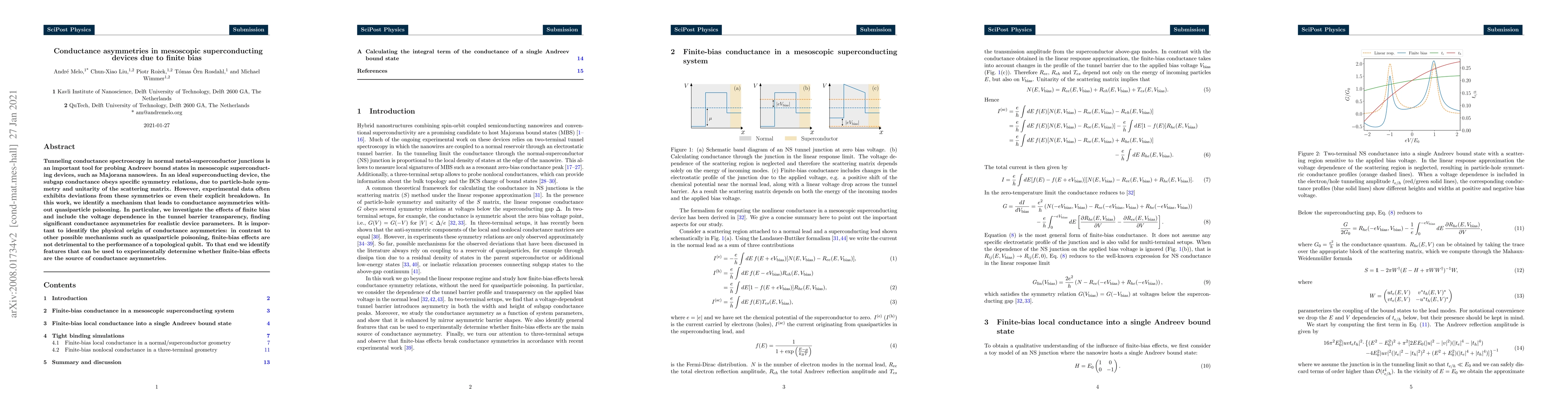 This paper investigates conductance asymmetries in mesoscopic superconducting devices due to finite bias, identifying a mechanism that leads to such asymmetries without quasiparticle poisoning. It highlights the voltage dependence in tunnel barrier transparency and suggests features to experimentally determine if finite-bias effects are the source of these asymmetries, noting they do not harm topological qubit performance.