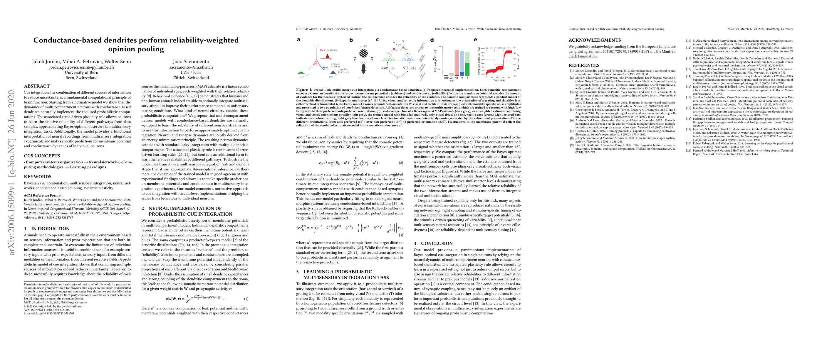Cue integration, the combination of different sources of information to reduce uncertainty, is a fundamental computational principle of brain function. Starting from a normative model we show that the dynamics of multi-compartment neurons with conductance-based dendrites naturally implement the required probabilistic computations. The associated error-driven plasticity rule allows neurons to learn the relative reliability of different pathways from data samples, approximating Bayes-optimal observers in multisensory integration tasks. Additionally, the model provides a functional interpretation of neural recordings from multisensory integration experiments and makes specific predictions for membrane potential and conductance dynamics of individual neurons.