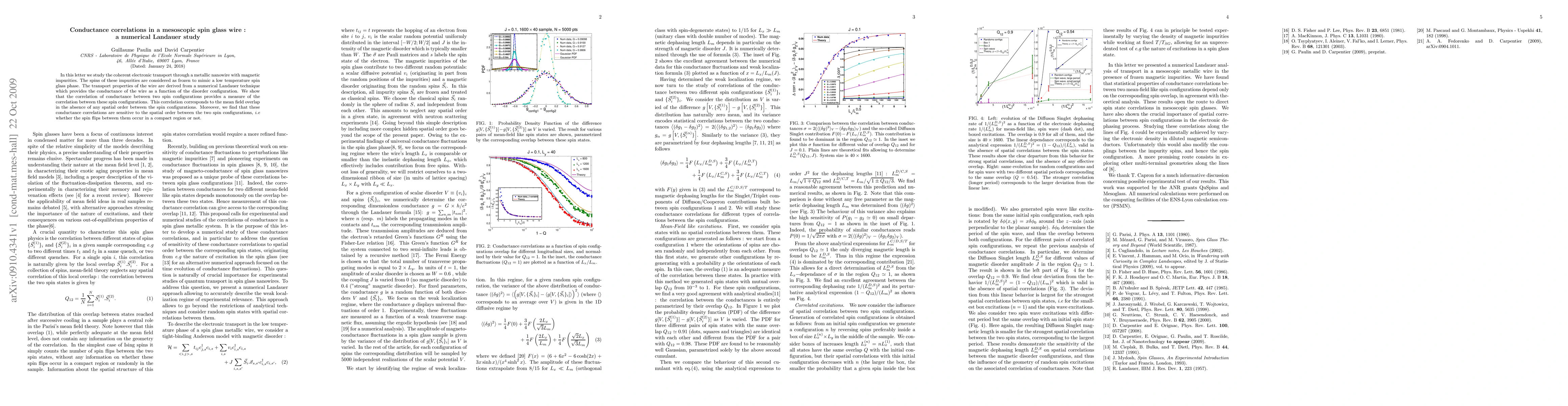 In this letter we study the coherent electronic transport through a metallic nanowire with magnetic impurities. The spins of these impurities are considered as frozen to mimic a low temperature spin glass phase. The transport properties of the wire are derived from a numerical Landauer technique which provides the conductance of the wire as a function of the disorder configuration. We show that the correlation of conductance between two spin configurations provides a measure of the correlation between these spin configurations. This correlation corresponds to the mean field overlap in the absence of any spatial order between the spin configurations. Moreover, we find that these conductance correlations are sensitive to the spatial order between the two spin configurations, i.e whether the spin ?ips between them occur in a compact region or not.