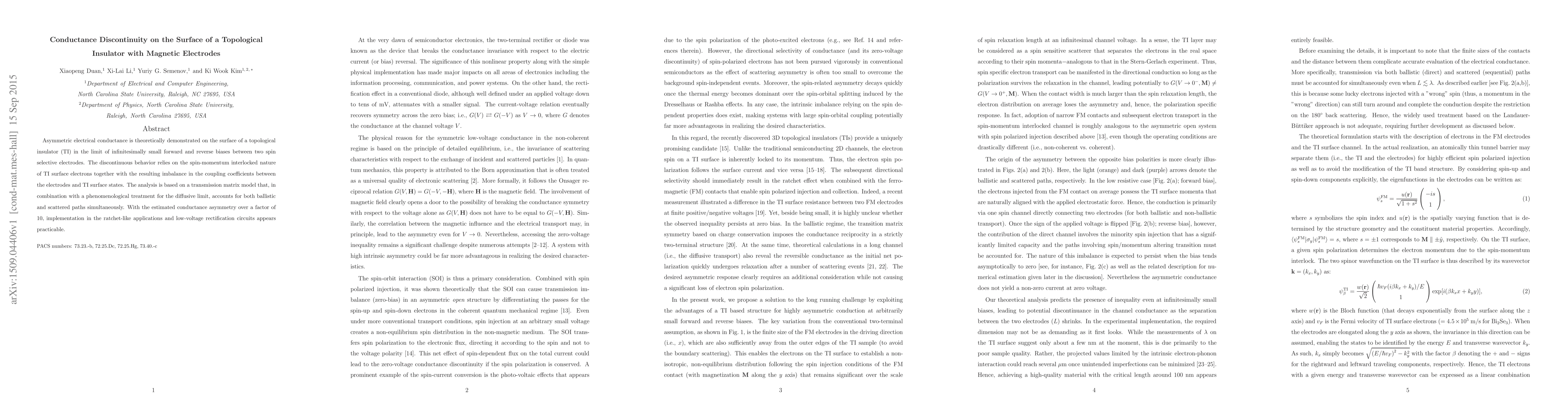 Asymmetric electrical conductance is theoretically demonstrated on the surface of a topological insulator (TI) in the limit of infinitesimally small forward and reverse biases between two spin selective electrodes. The discontinuous behavior relies on the spin-momentum interlocked nature of TI surface electrons together with the resulting imbalance in the coupling coefficients between the electrodes and TI surface states. The analysis is based on a transmission matrix model that, in combination with a phenomenological treatment for the diffusive limit, accounts for both ballistic and scattered paths simultaneously. With the estimated conductance asymmetry over a factor of 10, implementation in the ratchet-like applications and low-voltage rectification circuits appears practicable.