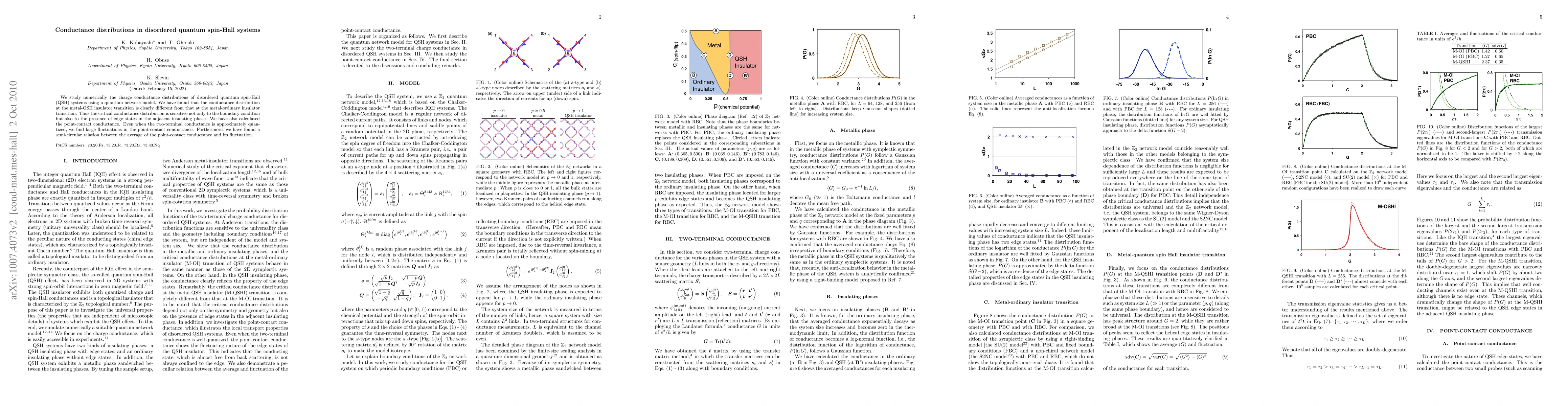 This paper numerically investigates the conductance distributions in disordered quantum spin-Hall systems, revealing distinct differences between metal-QSH insulator and metal-ordinary insulator transitions. It also uncovers significant fluctuations in point-contact conductance despite two-terminal quantization, along with a semi-circular relationship between average and fluctuation in point-contact conductance.
