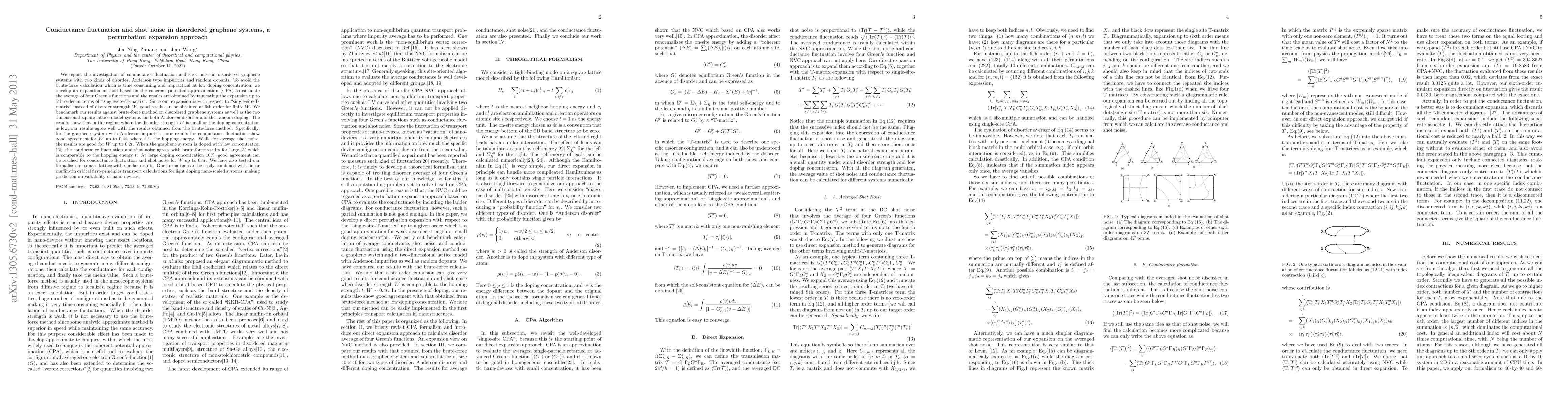 This paper develops a perturbation expansion method based on the coherent potential approximation to study conductance fluctuations and shot noise in disordered graphene systems with Anderson impurities and random dopants. The proposed method, truncated at 6th order in the "single-site-T-matrix," yields accurate results for low doping concentrations and small disorder strengths, showing good agreement with brute-force calculations for $W$ up to $0.4t$ in graphene and comparable lattice models.