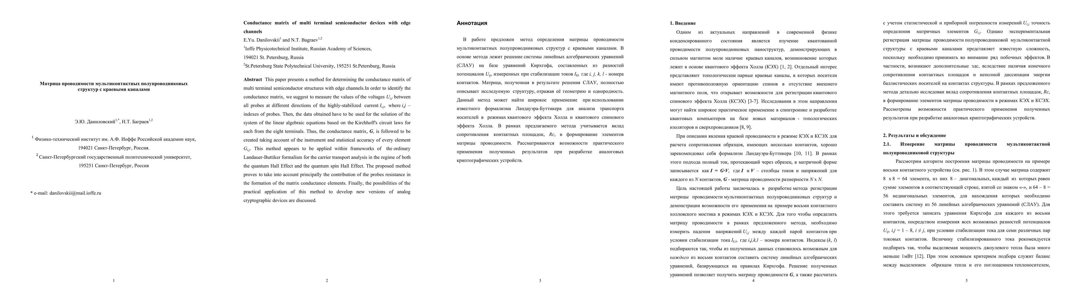 This paper presents a method for determining the conductance matrix of multi terminal semiconductor structures with edge channels. This method appears to be applied within frameworks of the ordinary Landauer - uttiker formalism for the carrier transport analysis in the regime of both the quantum Hall Effect and the quantum spin Hall Effect. The proposed method proves to take into account principally the contribution of the probes resistance in the formation of the matrix conductance elements. Finally, the possibilities of the practical application of this method to develop new versions of analog cryptographic devices are discussed.