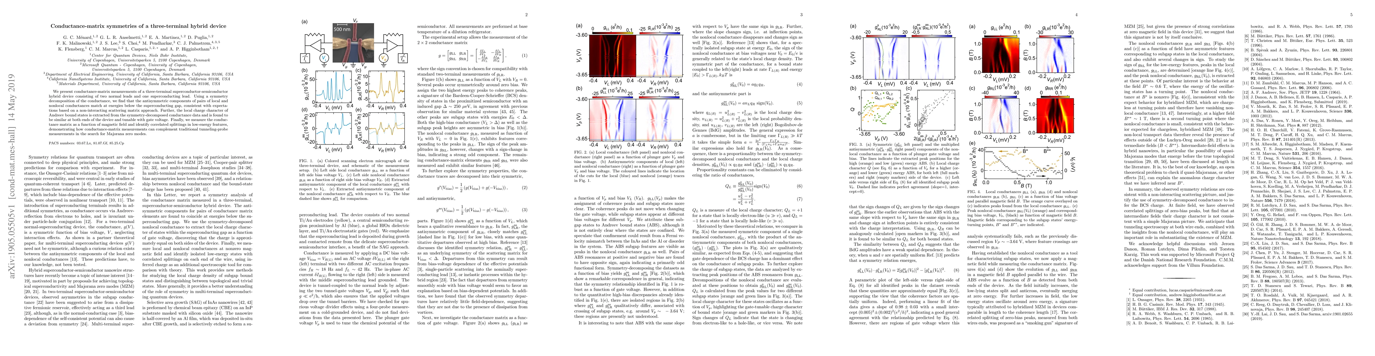 We present conductance-matrix measurements of a three-terminal superconductor-semiconductor hybrid device consisting of two normal leads and one superconducting lead. Using a symmetry decomposition of the conductance, we find that the antisymmetric components of pairs of local and nonlocal conductances match at energies below the superconducting gap, consistent with expectations based on a non-interacting scattering matrix approach. Further, the local charge character of Andreev bound states is extracted from the symmetry-decomposed conductance data and is found to be similar at both ends of the device and tunable with gate voltage. Finally, we measure the conductance matrix as a function of magnetic field and identify correlated splittings in low-energy features, demonstrating how conductance-matrix measurements can complement traditional tunneling-probe measurements in the search for Majorana zero modes.