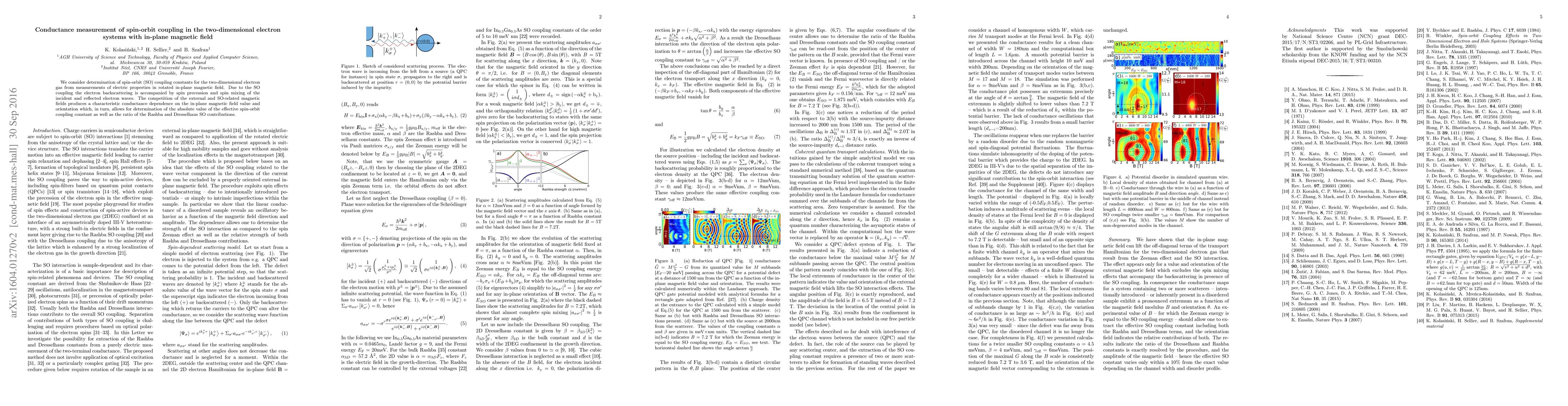 We consider determination of spin-orbit (SO) coupling constants for the two-dimensional electron gas from measurements of electric properties in rotated in-plane magnetic field. %Due to the interplay Due to the SO coupling the electron backscattering is accompanied by spin precession and spin mixing of the incident and reflected electron waves. The competition of the external and SO-related magnetic fields produces a characteristic conductance dependence on the in-plane magnetic field value and orientation which, in turn, allows for determination of the absolute value of the effective spin-orbit coupling constant as well as the ratio of the Rashba and Dresselhaus SO contributions.