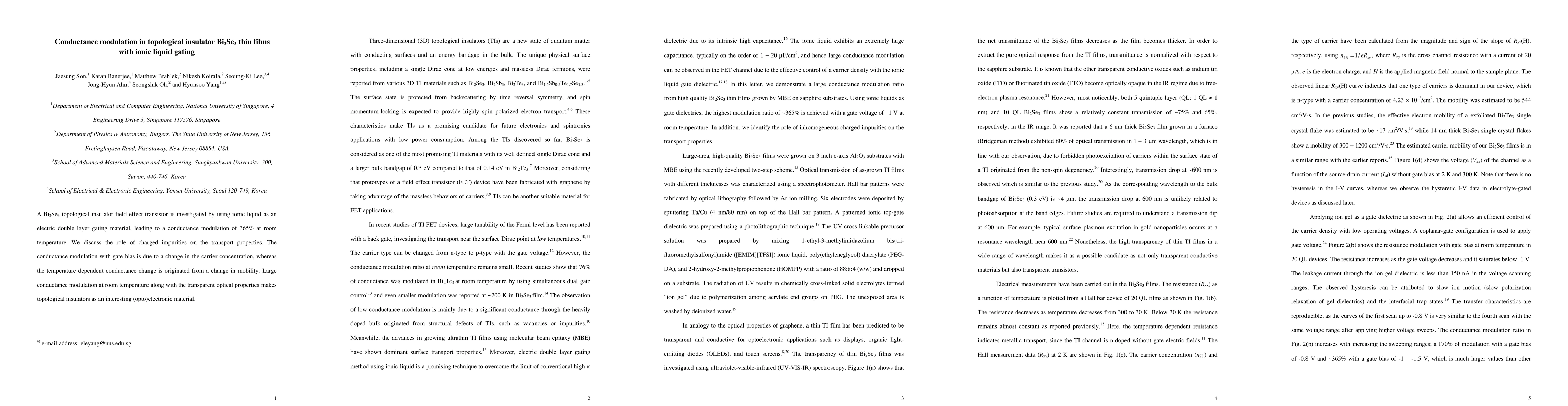 Summary: This study investigates conductance modulation in Bi2Se3 thin films using ionic liquid gating, achieving a 365% modulation at room temperature. The modulation is attributed to carrier concentration changes with gate bias, while temperature-dependent changes arise from mobility variations, highlighting the potential of topological insulators in optoelectronics.